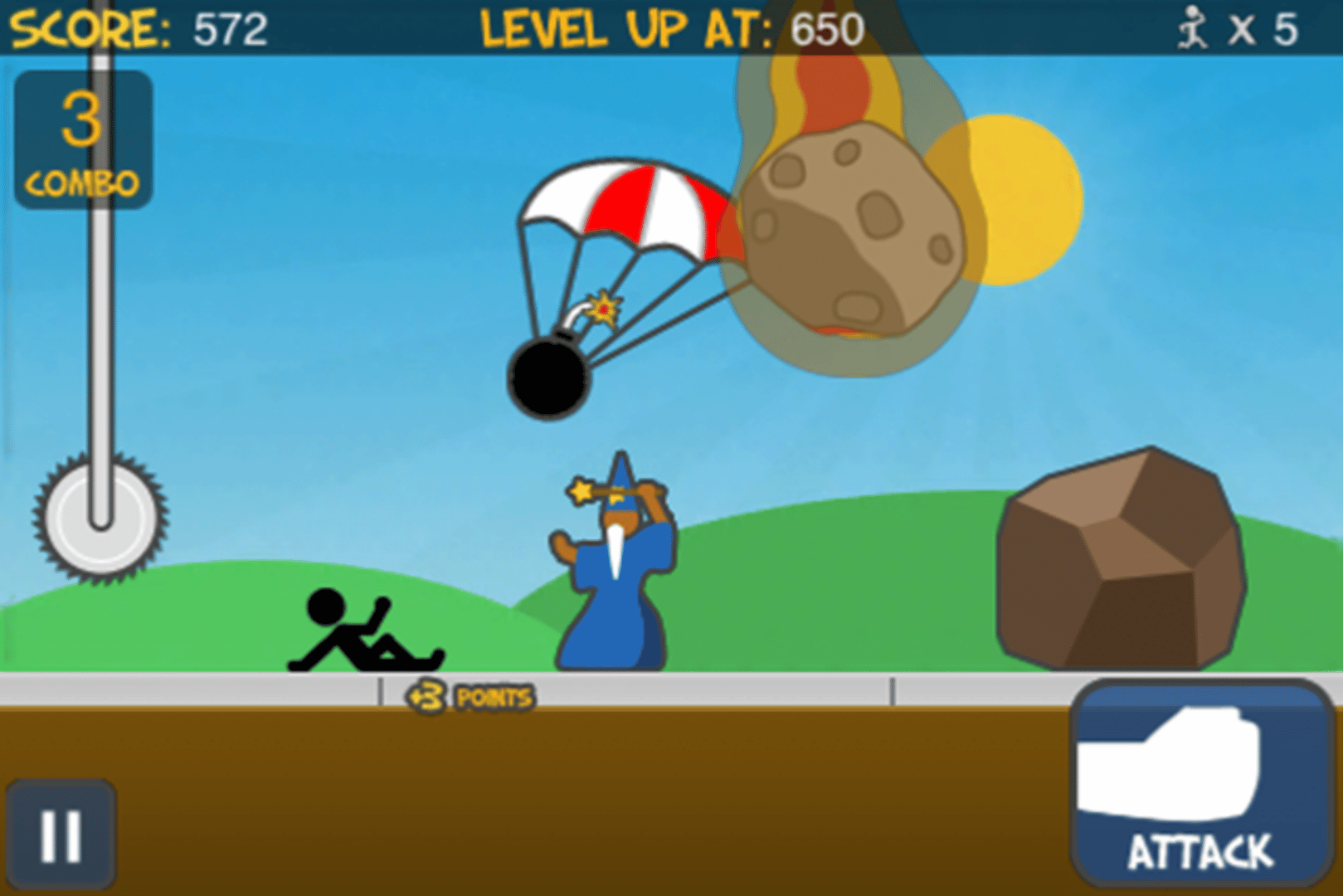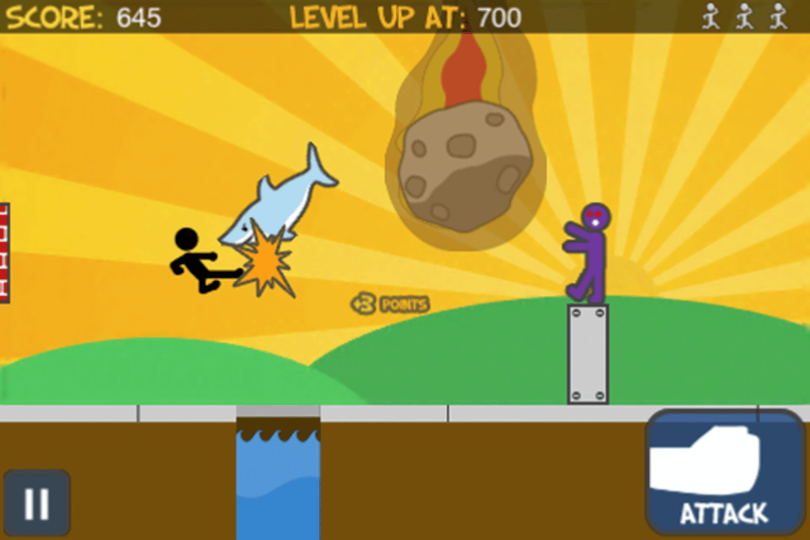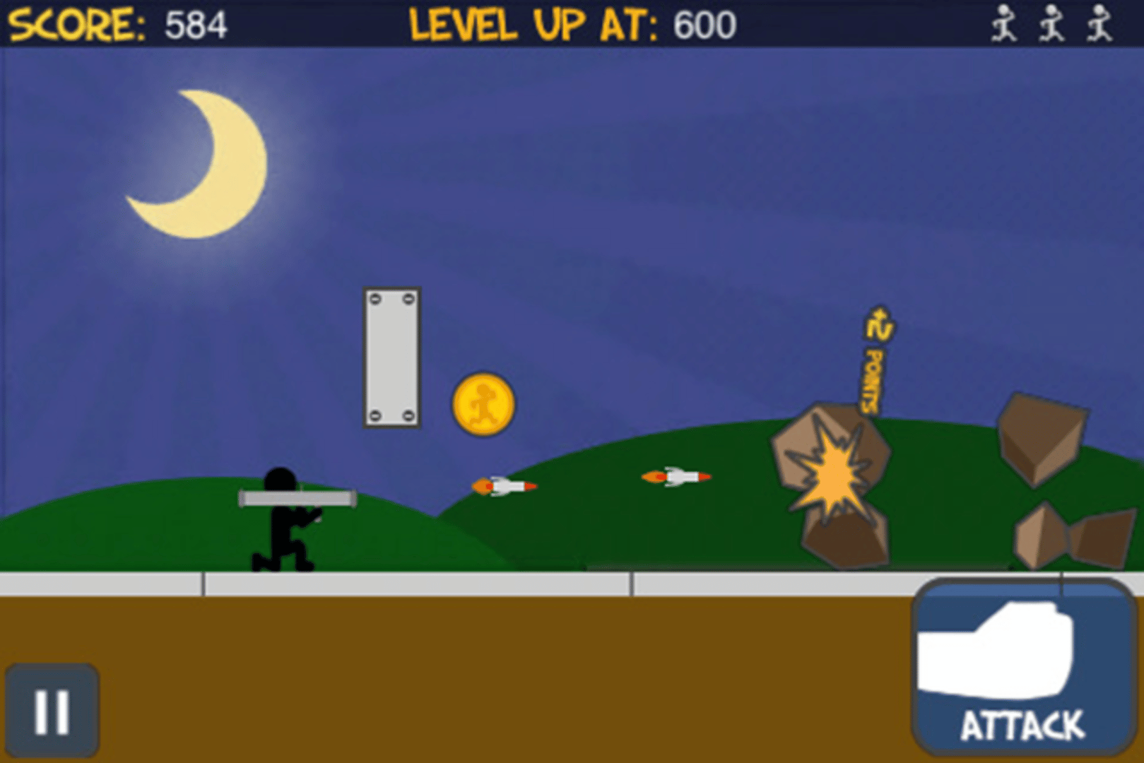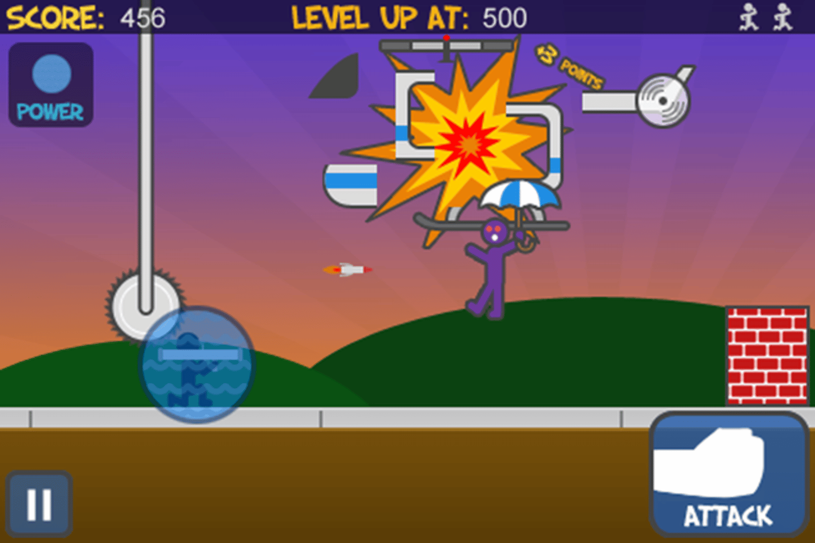 Simple to understand, yet challenging to master, Run! is an addictive game where you must jump, slide, defend and destroy your way through an eccentric variety of obstacles while running at increasingly faster speeds. You'll have to punch/kick obstacles out of your way, and launch missiles at others to destroy them before they destroy you. The controls are simple: swipe up to jump, swipe down to slide, tap the attack button to punch/kick, and tap on certain obstacles to fire missiles and destroy them.