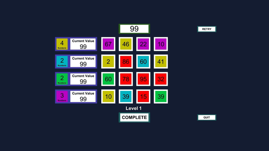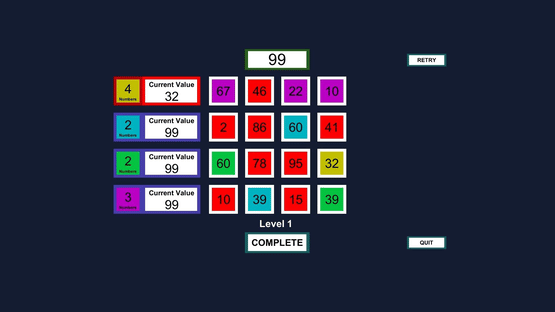 Digit Daze is a fun and challenging mathematical puzzle game. You are given a main number less than 100 and one to four color goals to complete with the 16 provided digits. Each color goal can require 2 to 4 numbers to reach the main number.