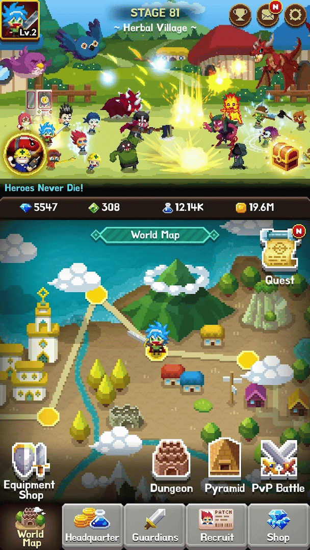 Guardians keep on going through the stages of the game, even when you're not playing! An auto-combat game with cute dot graphics and retro game nostalgia! Never die, Endless Rebirth IDLE Guardians!