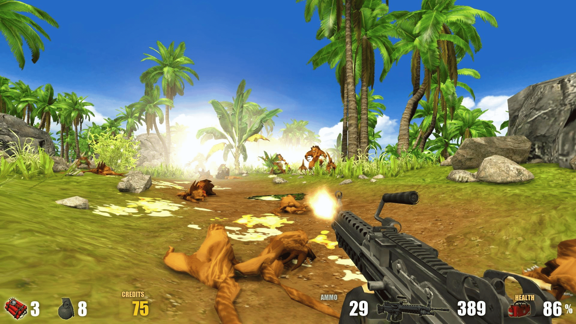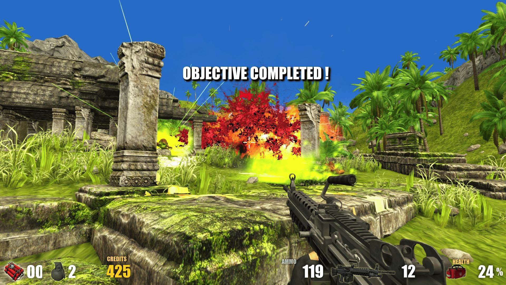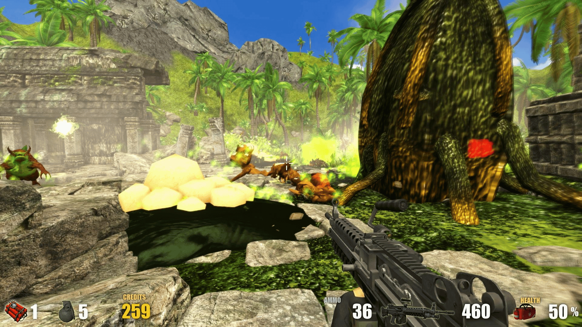 Sent with a revolver and a machine gun, explore the sea with your boat and plan your attacks on islands infested with aliens. Blow up bungalows, buildings, aliens installation and nests on your ways to clear them from the alien presence !