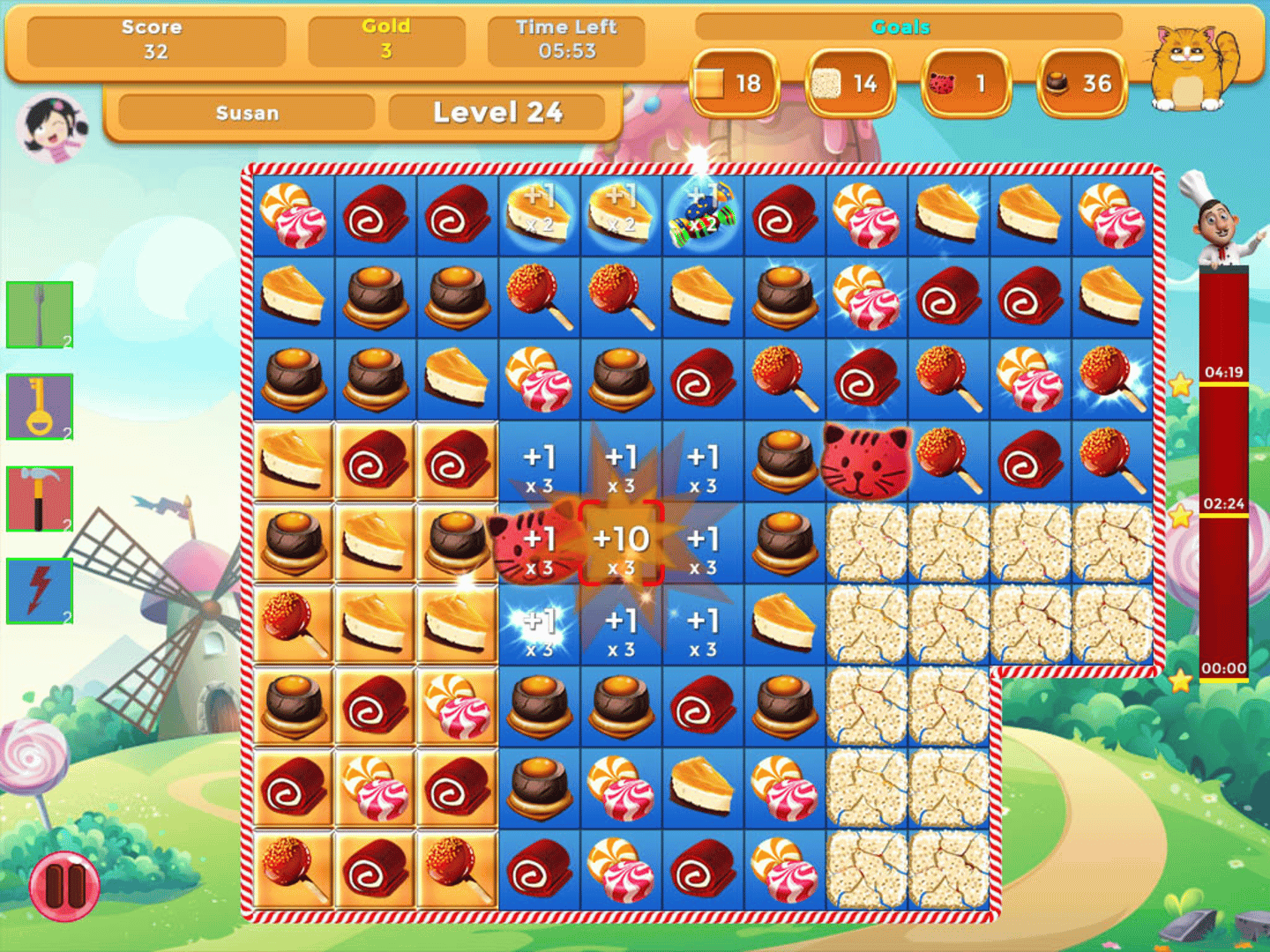 Fun and colorful candy themed match 3 game. Featuring 100 levels. Work your way up the ladder and become a mastery pastry chef.