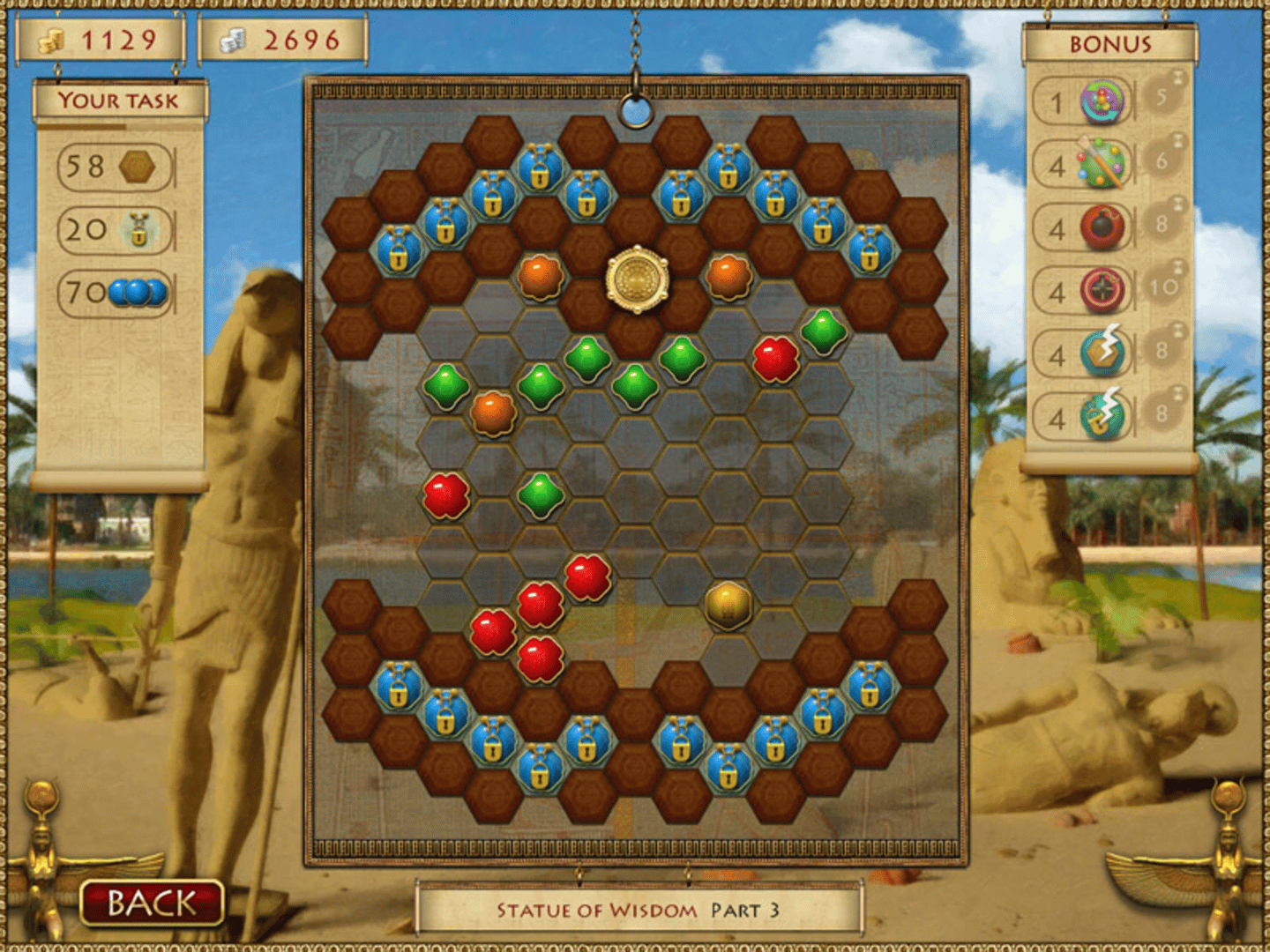 Hexus is a unique game that combines several casual genres, the mixture of which creates the unforgettable atmosphere of Ancient Egypt. The story line revolves around 10 legendary Egyptian artifacts that should be found. A player’s path runs through 120 unique game-levels – puzzles. The player will have to open 15 various mini-games: ranging from Hidden objects to Nilotic mahjong. The action of the game goes around construction and development of a town that the player reigns over. A great number of available constructions and decorative elements, full freedom in town-design plus game-bonuses that town constructions account for, will make a strategic process of town running extremely interesting and breathtaking. The player will be surrounded by responsive assistants and therefore will be able to concentrate only on puzzle-solving. It’s worth mentioning the range of options of this game to create, modify and decorate the player’s avatar. There is a face generator and a clothes shop in the game (70 items for a male avatar and 75 – for a female avatar). Two extra games, classical Lines and Collapse, will go together with the main game. The unforgettable Egyptian journey is waiting for you, try yourself at the role of a powerful Pharaoh or a wize Queen.