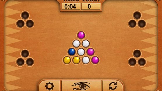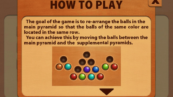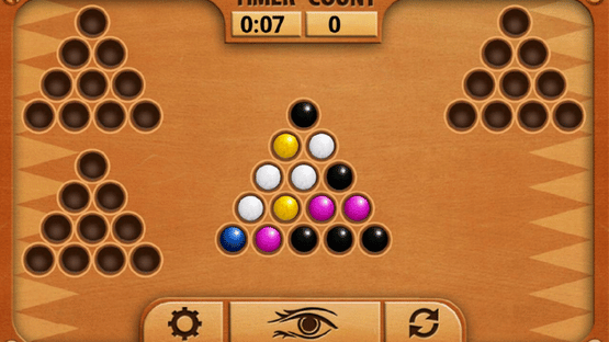 In this simple yet addictive game you will have to move marbles of various colors on a game board. The slots for the marbles are organized into pyramids; there is one main pyramid in the center and one or more supplemental pyramids around it. The game starts with the main pyramid fully filled with randomly shuffled marbles. Your goal is to move the marbles back and forth between the pyramids so that all marbles in the main pyramid are sorted by color (all marbles of the same color are on the same row). You can only move the marbles laying on top of other marbles (and don't have any marbles on top of them) and you can only move them to another slot in the same or any other pyramid where they will be on top of other marbles as well. You can set up your own board by selecting the size of the main pyramid and the number and sizes of supplemental pyramids. You can also play a scenario (easy, medium, or hard) where you need to go through a sequence of levels with time or count limits.