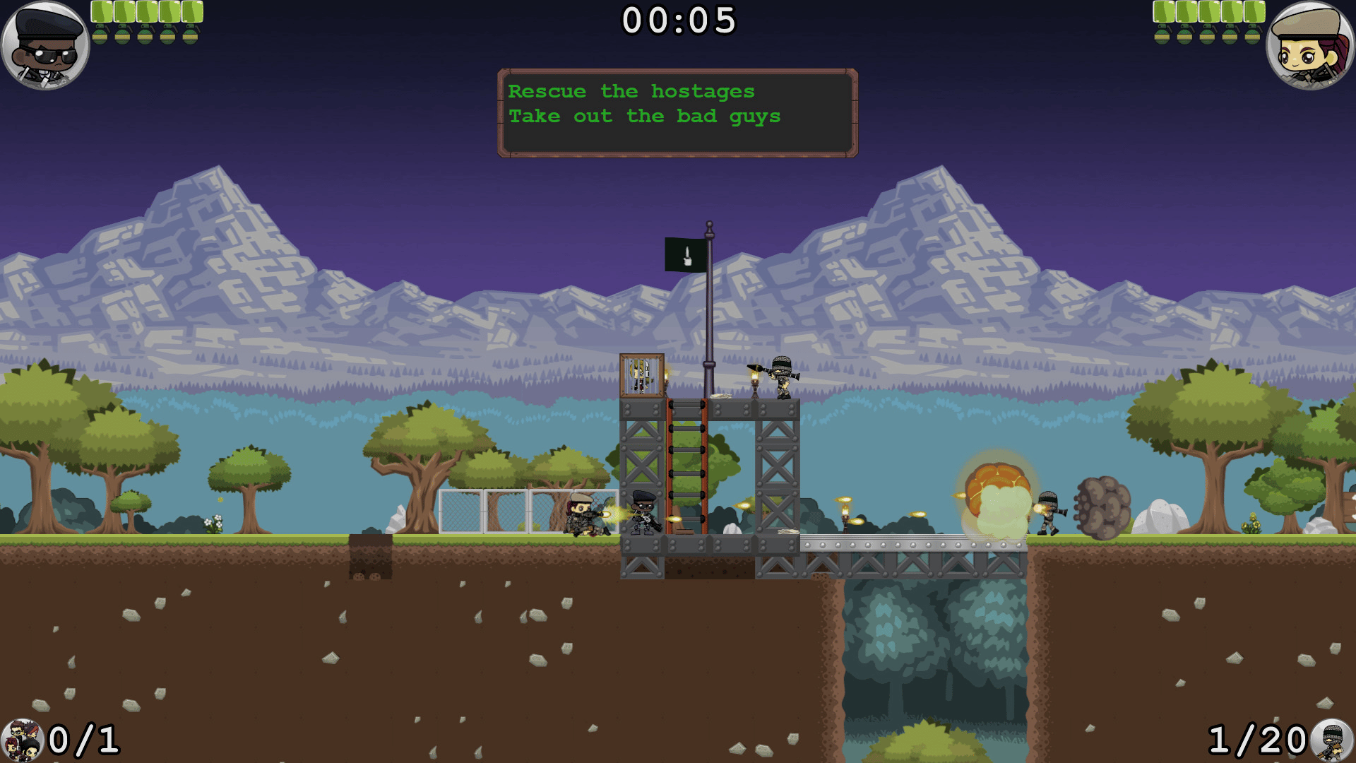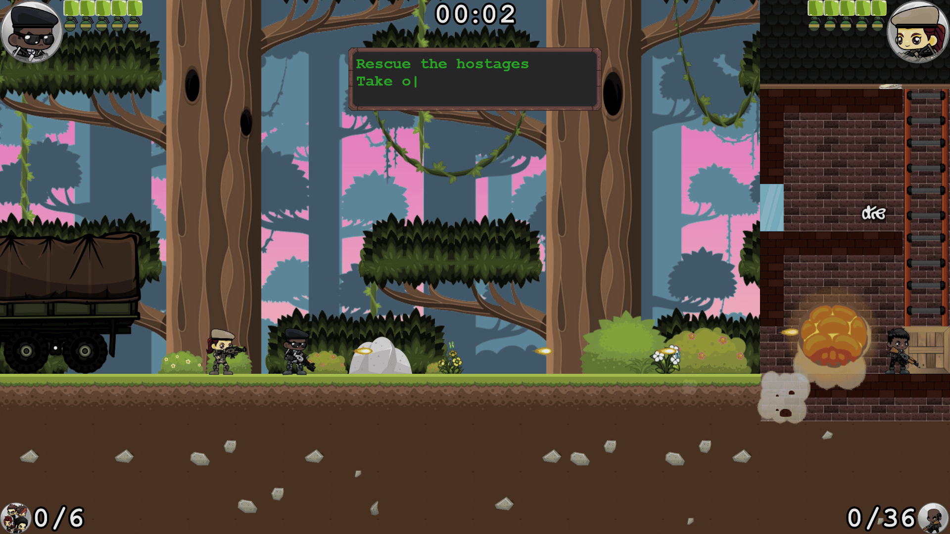 Fortune & Gloria is an action platformer where you and a friend (optional) save the day in procedurally generated missions! Grab your trusty assault rifle, a handful of grenades, and join Nate "Fortune" Cobb and Gloria Guerrero on a mission to rescue hostages, take out the bad guys and blow stuff up!