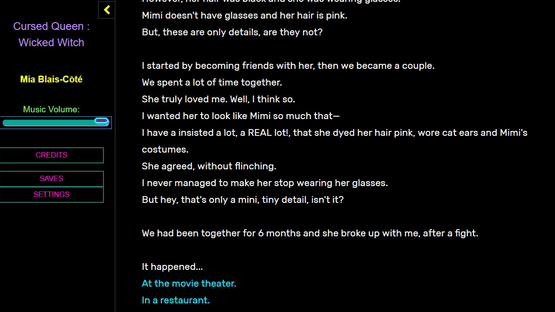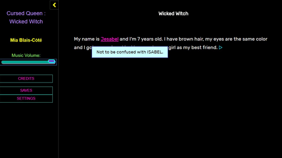 Cursed Queen : Wicked Witch is a text-based game released on 2018 on PC. Two short stories written in Twine. The tales of Denis, Jesabel, the Dark Fairies and Shirina.
