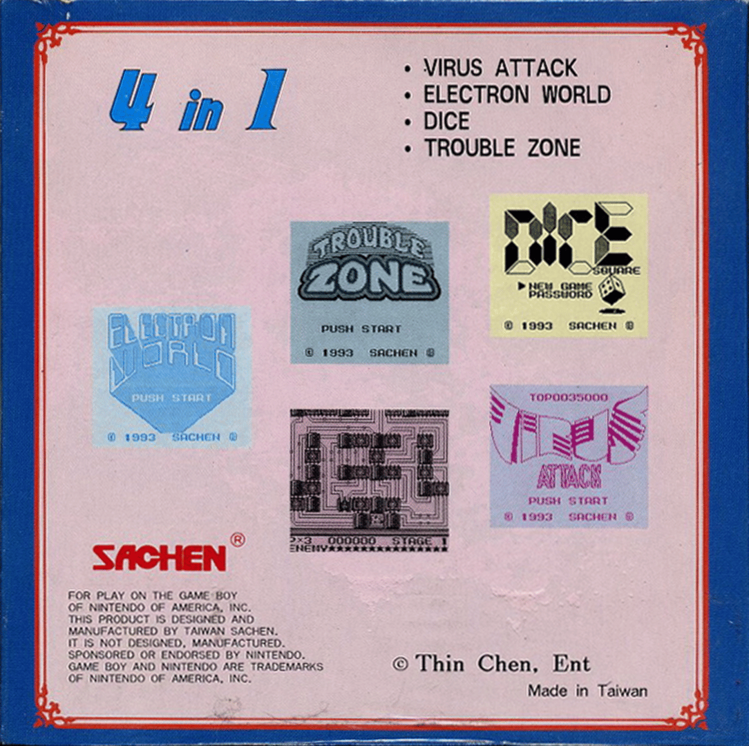 4-in-1 Version 2 was the second volume of 4-in-1 multicarts made by Sachen. It contains: Virus Attack, Electron World, Dice Square, and Trouble Zone.