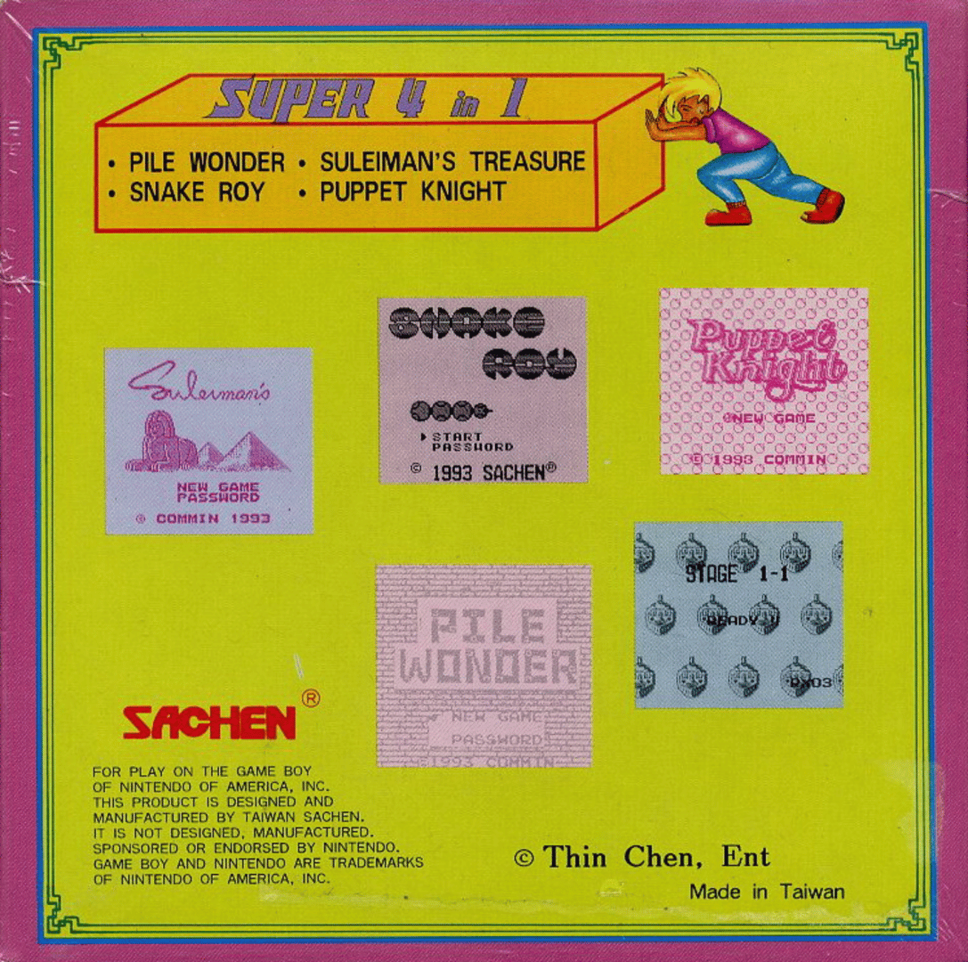 4-in-1 Version 4 was the fourth volume of 4-in-1 multicarts made by Sachen. It contains: Pile Wonder, Snake Roy, Suleiman's Treasure, and Puppet Knight.