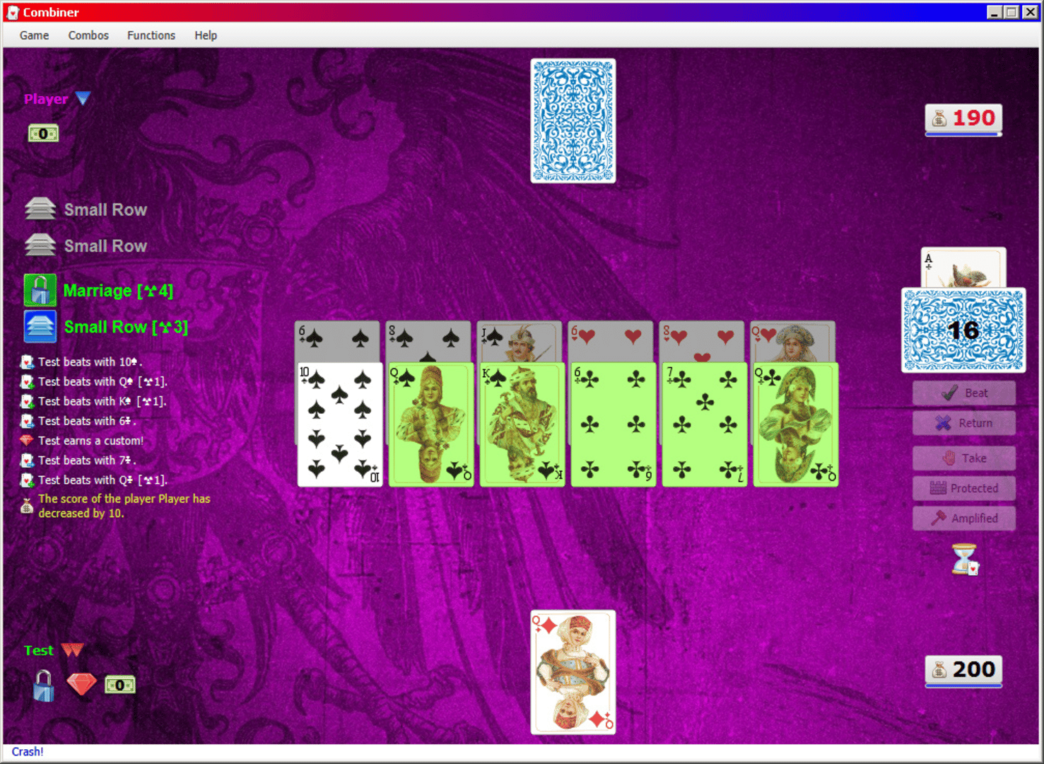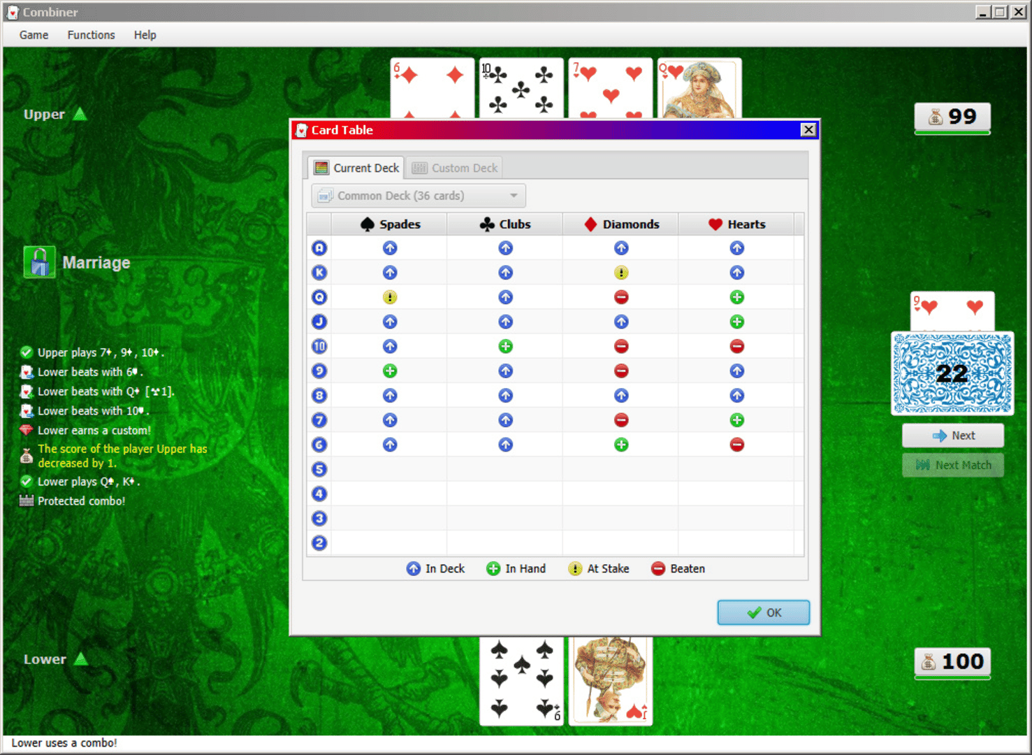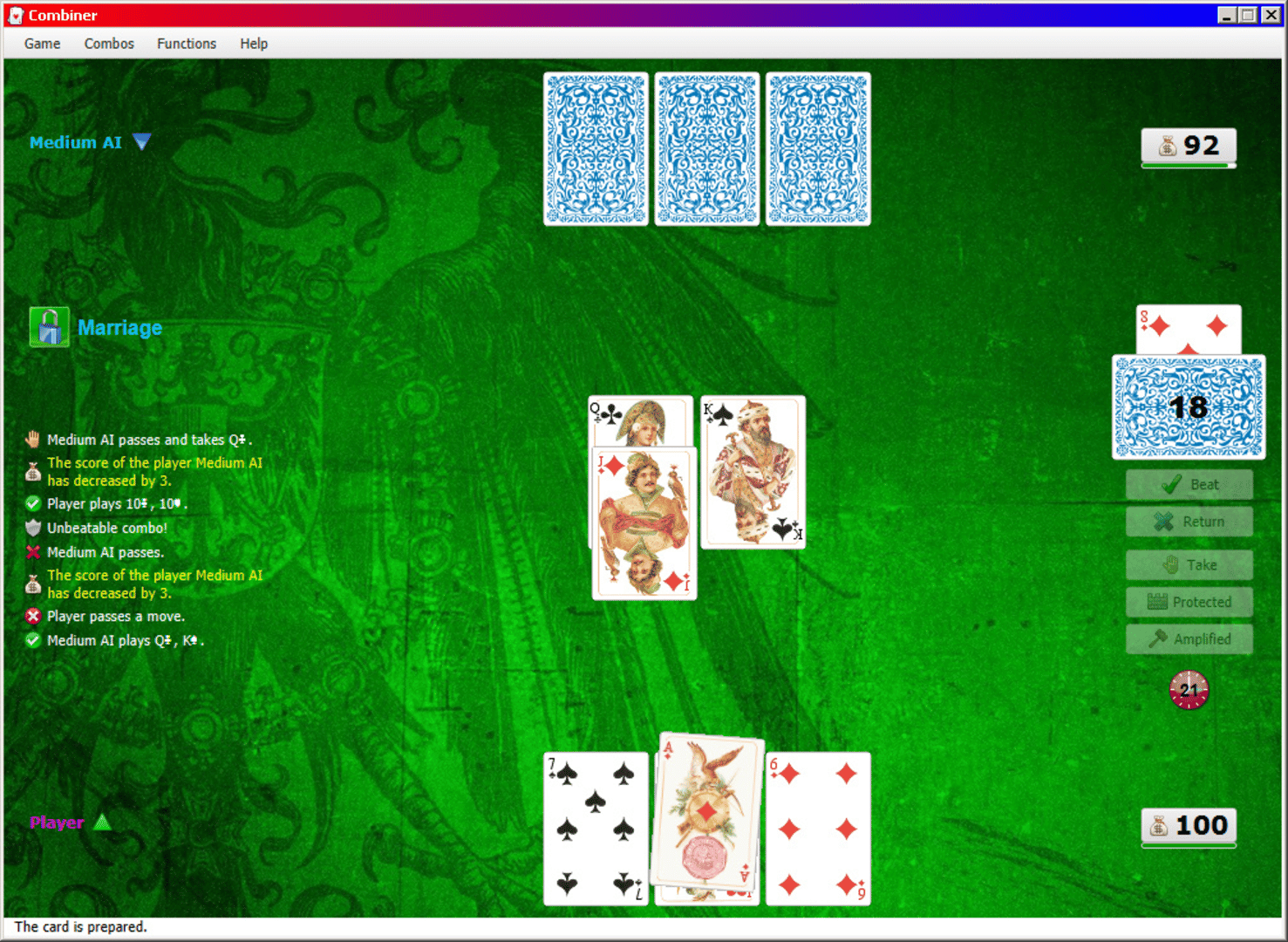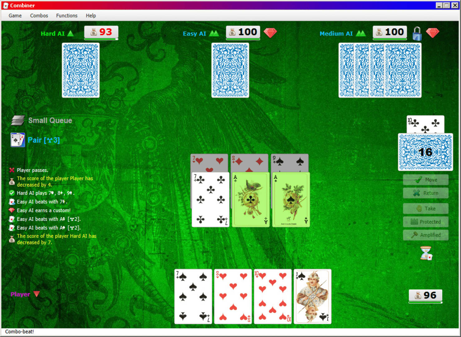 Digital version of the card game called "Combiner". The playing process is based upon the use of combinations in order to reduce the opponent's score. Play with computer players or on a local network (up to four players).