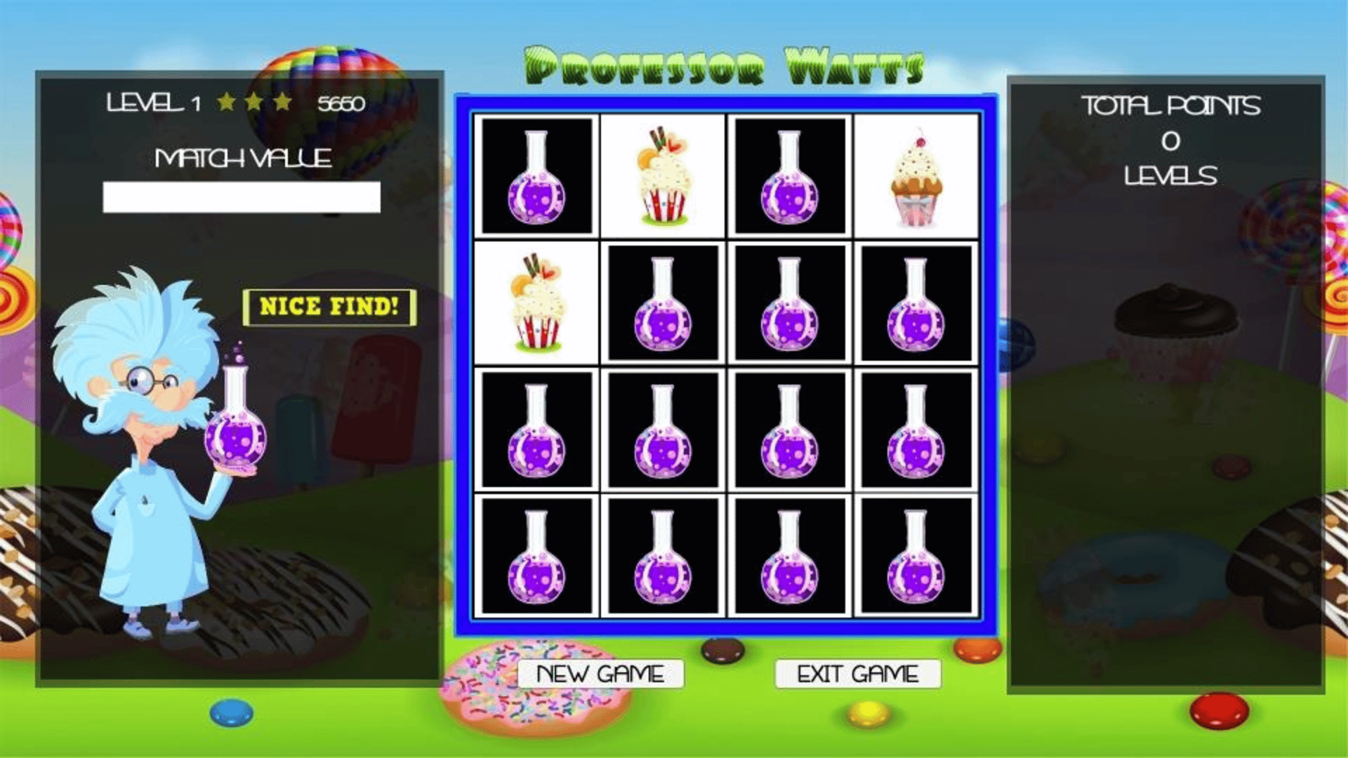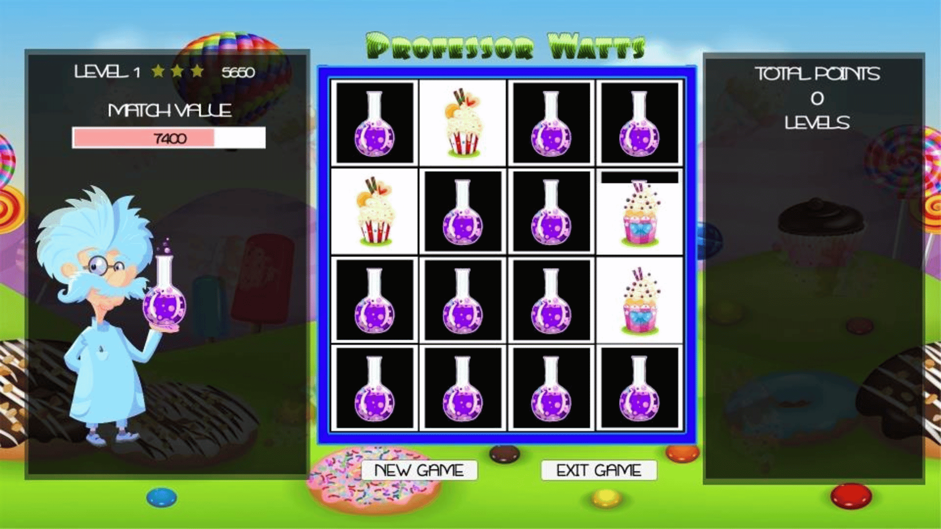 Hello Professor Watts here and I have some research to do on memory skills. I have assembled a wide variety of yummy cupcakes to put our memory to the test. We can see how we're doing by completing matches in a specific amount of time and earning points to track our overall progress