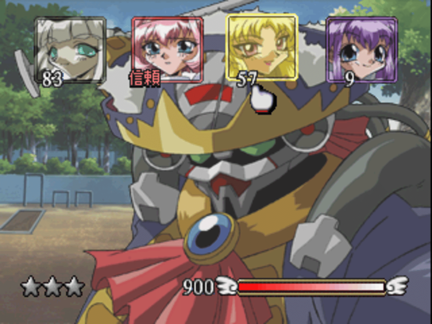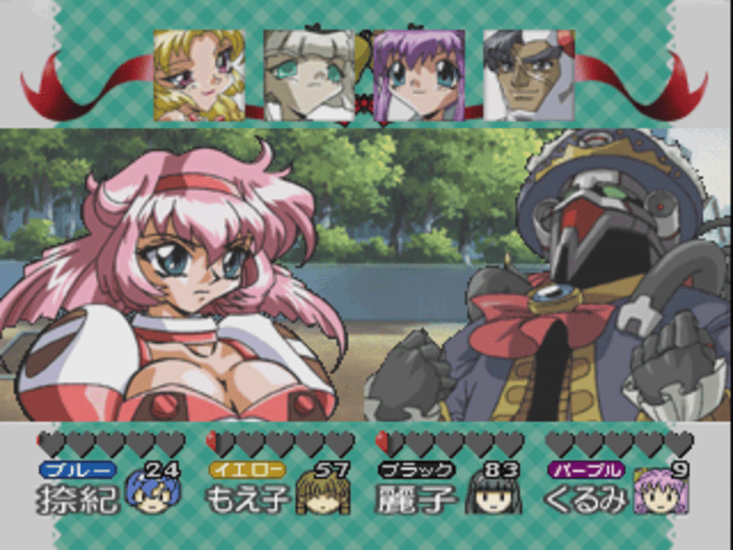 Himitsu Sentai Metamor V is a visual novel-style adventure game starring a cast of transforming magical girls. The game is divided into chapters and follows the five members of the Metamor V squad, all of them elementary school students and classmates of Sakie's. Much of the game consists of conversation sequences with other characters; the player's reactions and choices will affect Sakie's trust level with her squadmates, and through conversations the player will also learn different key words. Both of these are important during the battle sequences, in which the player must combine words in order to create the most effective special attacks. There is no lose condition, but the player is graded on how quickly they defeat opponents, which affects trust levels and ultimately the game's ending. The later PlayStation "Deluxe" version includes an extra bonus side scenario and additional voice acting, but is otherwise the same game.