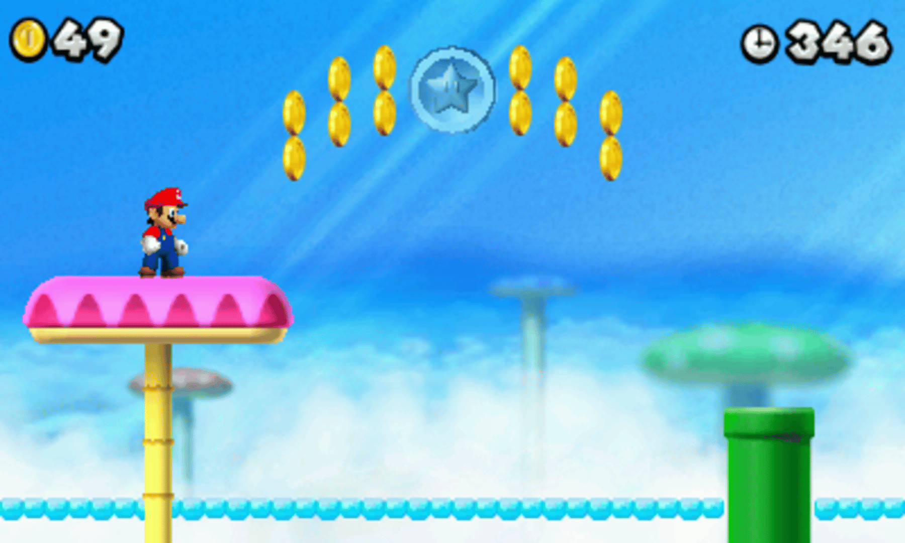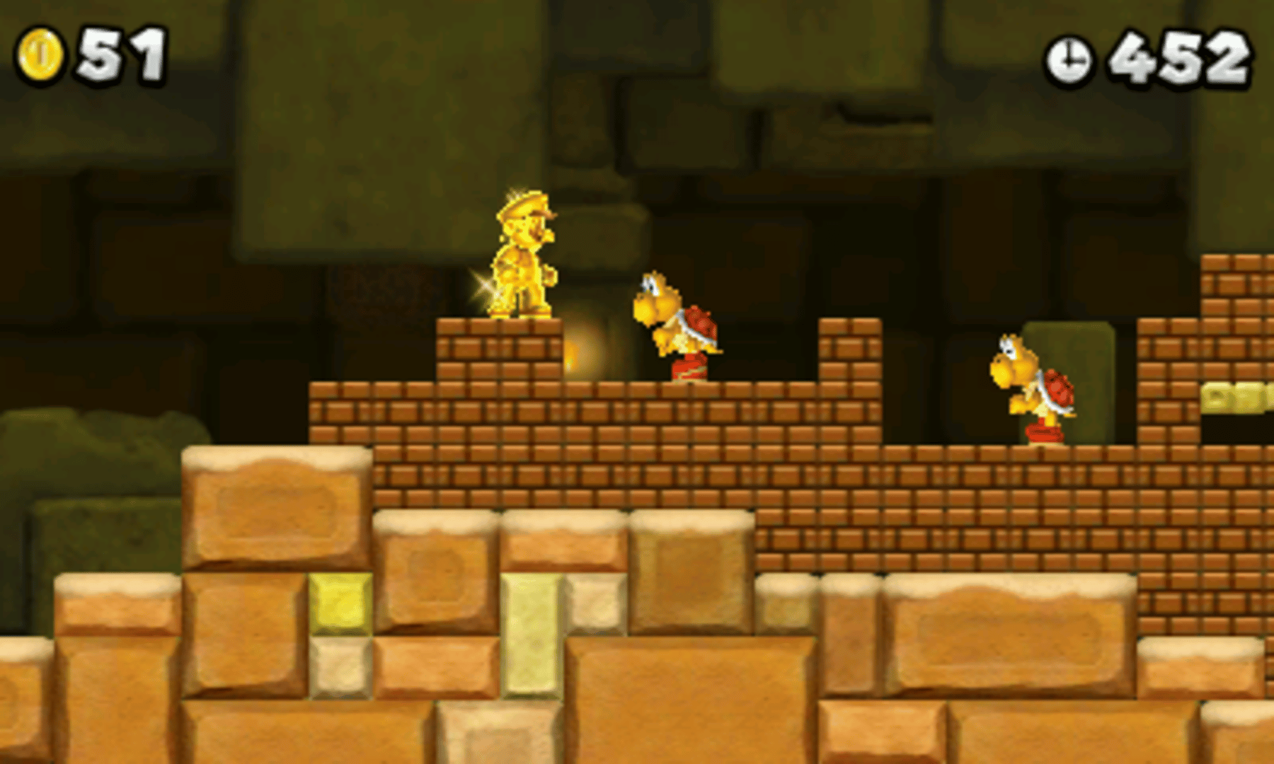 New Super Mario Bros. 2 is a side-scrolling 2.5D action-adventure platform game for the Nintendo 3DS. As the direct sequel to New Super Mario Bros., it is an indirect follow-up to New Super Mario Bros. Wii. The game's main focus is on coins, with the primary goal being to collect one million. To reach the goal, the game includes many new items to aid the player, such as the Gold Flower, which turns Mario into Gold Mario.