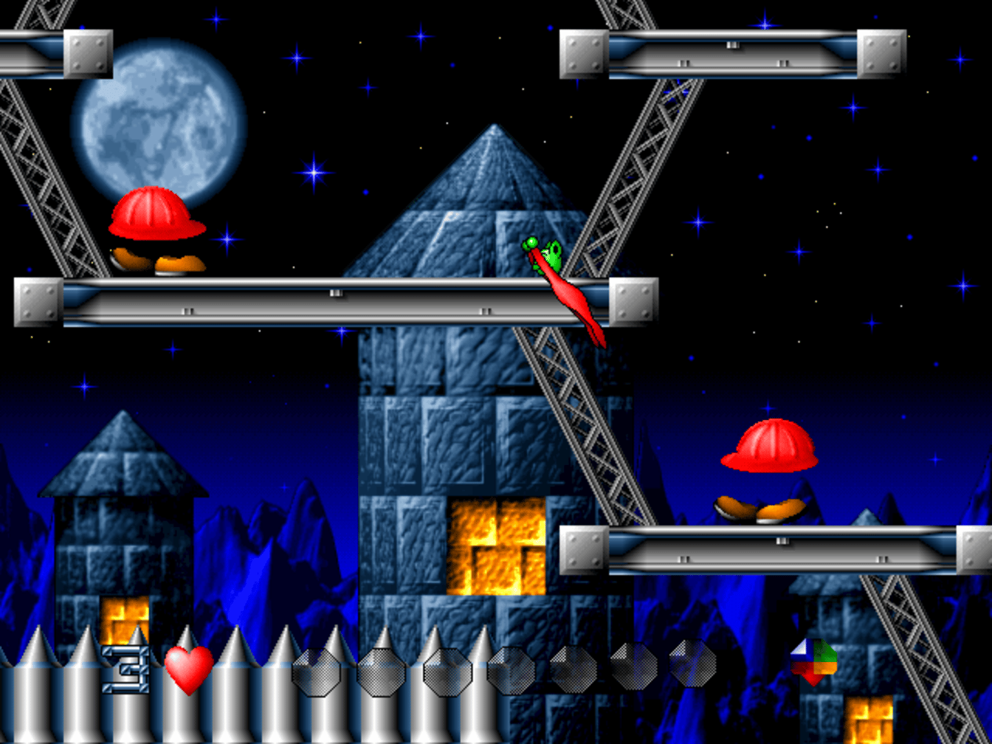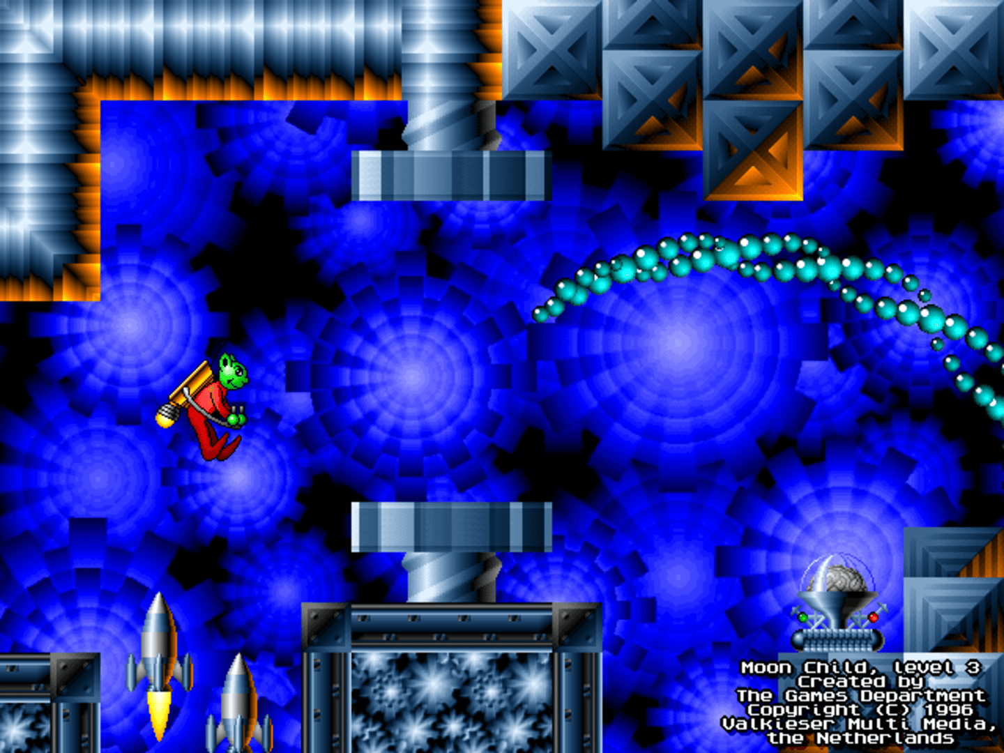 Guide Moon Child, a little green elf with magical mental and physical powers, on his quest to save the planet Utopia from an evil techno-virus, spread by a crashed meteor.