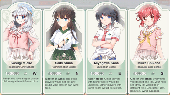 Mahjong Club is a casual mahjong game. 30 mahjong club members from different schools meet up for different goals. Based on authentic Japanese mahjong rules, character-based ability system is added for fun. Meet with cute school girls, and enjoy playing mahjong with them!