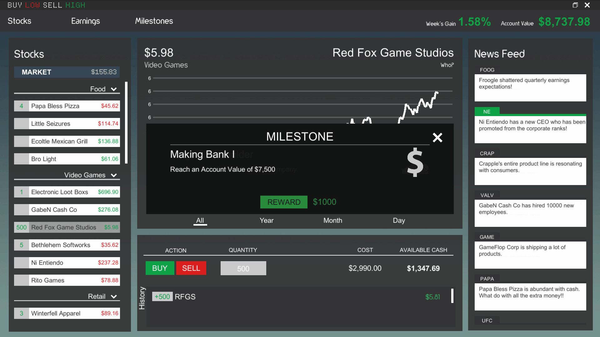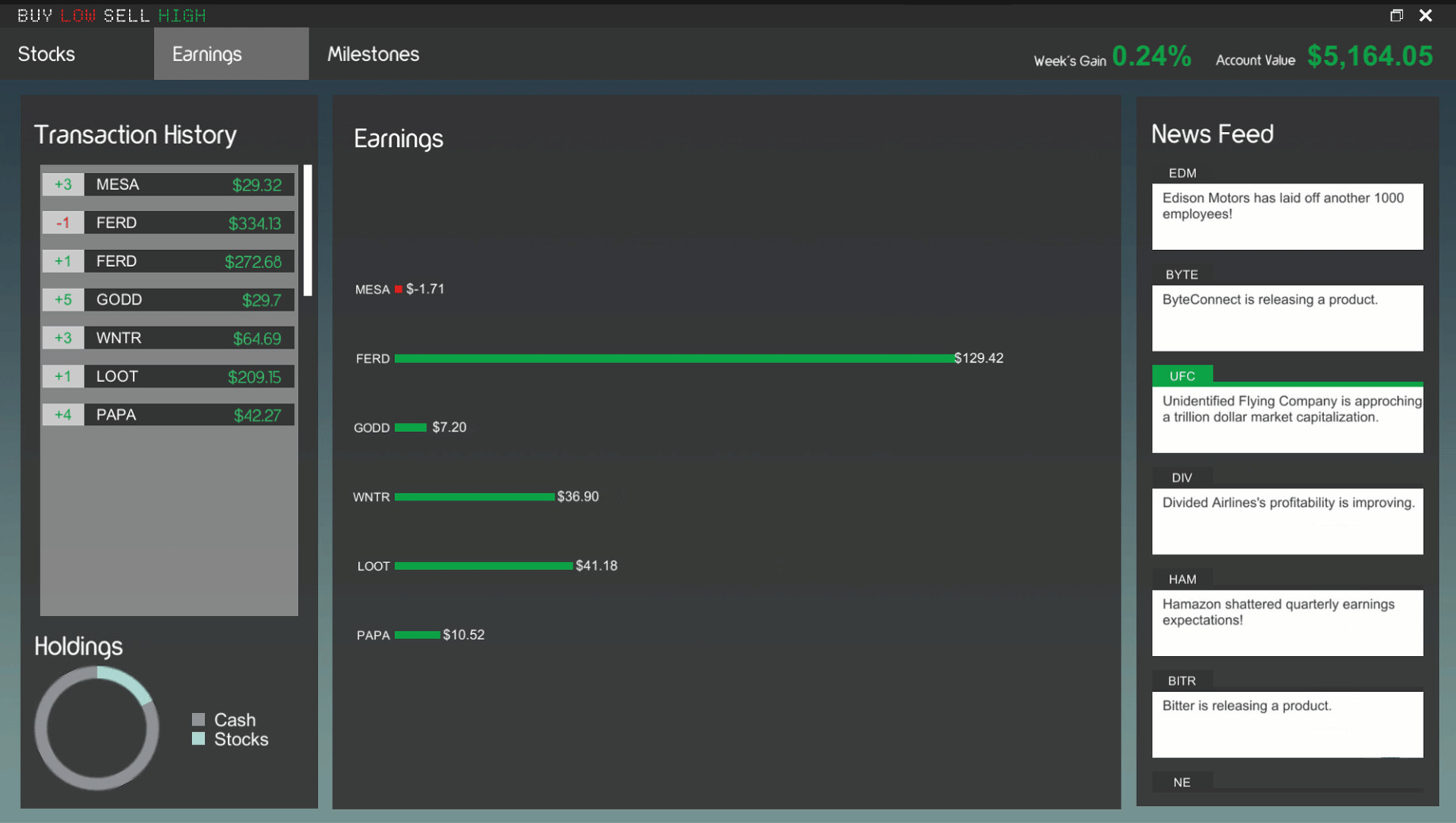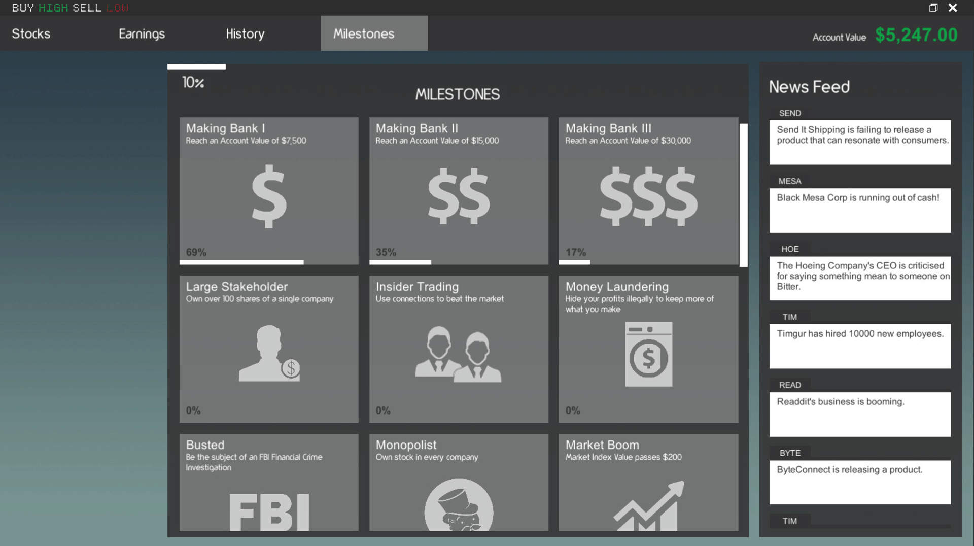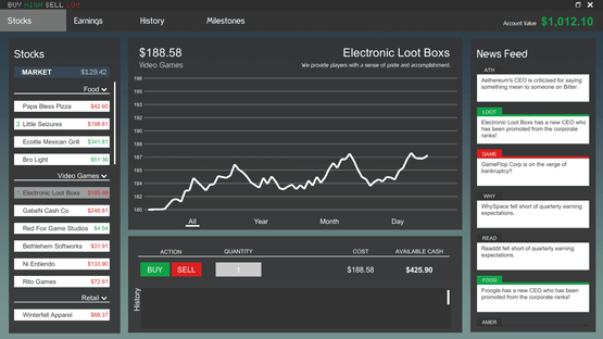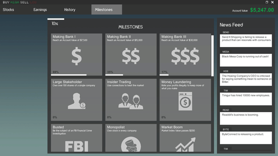Buy Low Sell High is a stock market game made to be easy to learn, fast-paced, and fun. The goal is to make as much money as you can starting with just $5,000. Good luck, have fun!