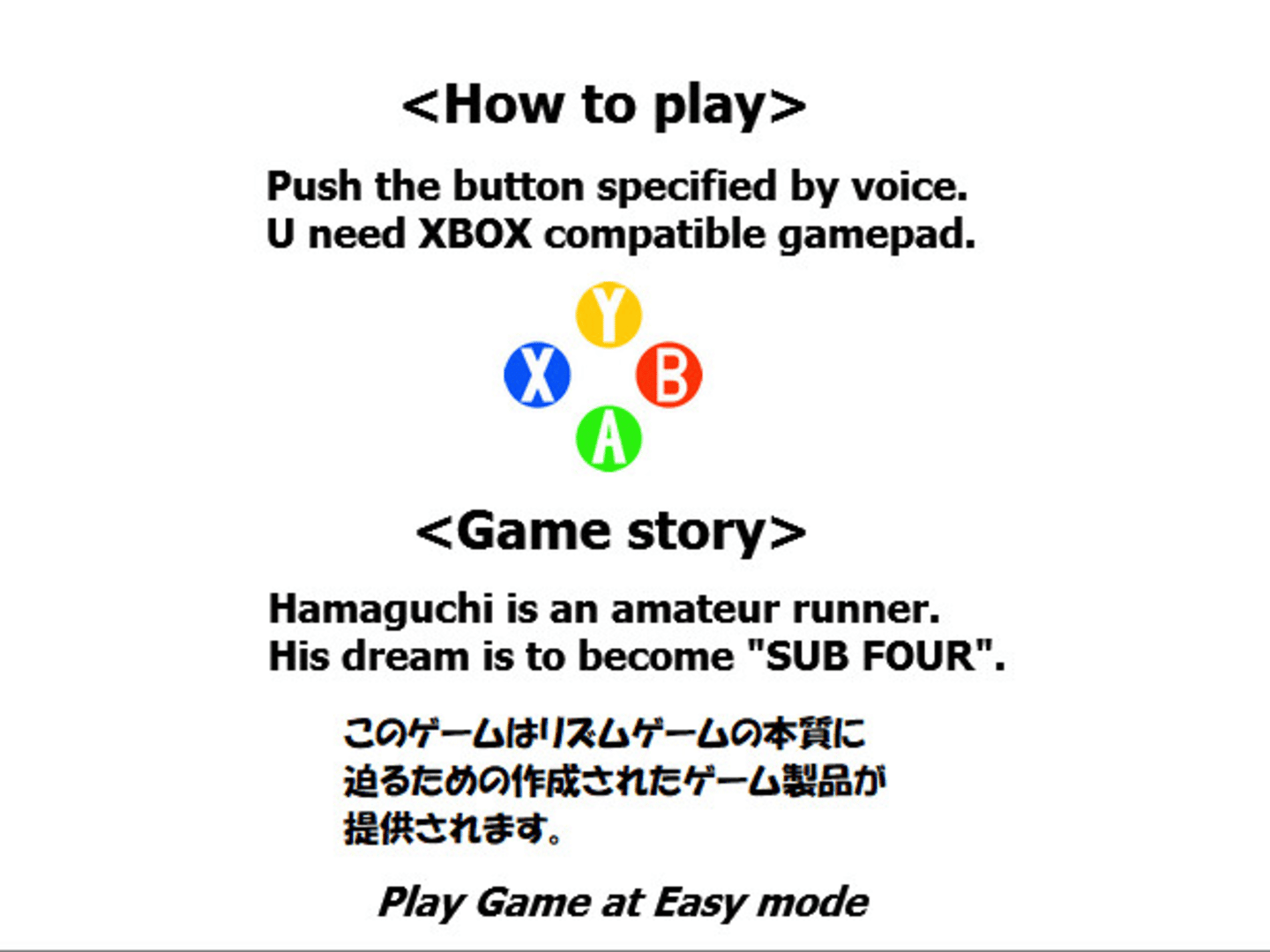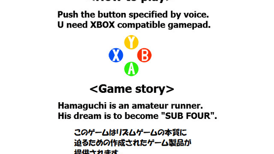 Player Hamaguchi is an amateur runner. His dream is to become "Sub Four". Become "Sub Four" playing like rhythm game.
