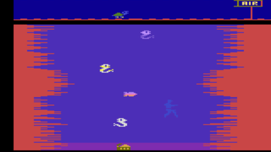 Aquaventure is a bit of a mystery in the prototype world. It was never mentioned in any Atari press releases nor does it show up on any internal part lists. Aquaventure seems to have popped out of the woodwork one day without any public fanfare nor any history behind its mysterious origins. In any case, Aquaventure seems to be complete and ready for release, we can only speculate as to why it was shelved. The game concept is simple; you must dive to the bottom of an undersea cavern and retrieve a fabulous treasure (which just happens to look like a small house of some sort). Along the way you must avoid fish, sea horses, and other underwater creatures attempting to block your path. Your diver came prepared however, for he is armed with a spear gun which he can use to temporarily kill one of the creatures. However, each enemy you kill is soon replaced by a faster and indestructible version of itself, so you need to carefully carve a path to the bottom only destroying the creatures that get in your way. After retrieving the treasure and returning it to the top of the cavern, a mermaid will appear. Touching the mermaid will take you to the next level, where you get to do it all over again. At the top of the screen there is a turtle, which shows how much air you have left. If the turtle reaches the Air sign at the far end of the screen before you complete the level you loose a life.