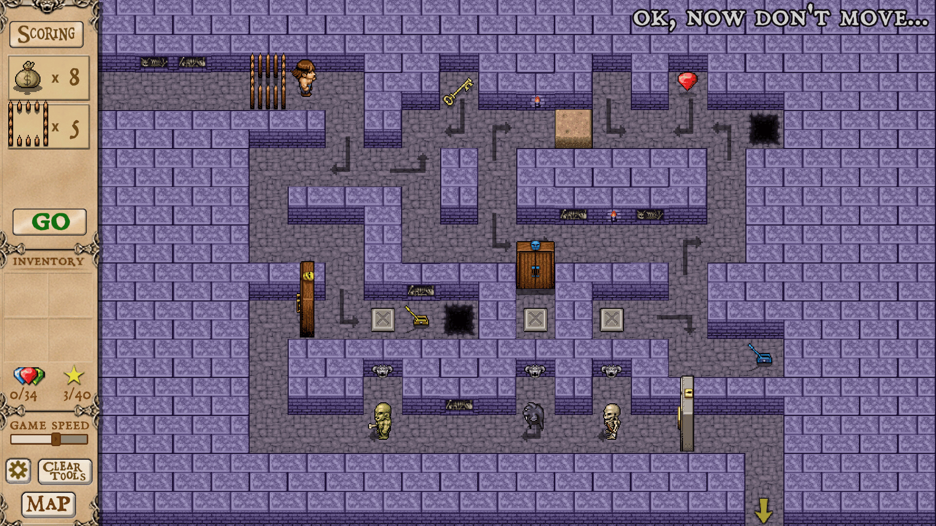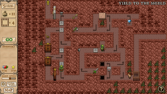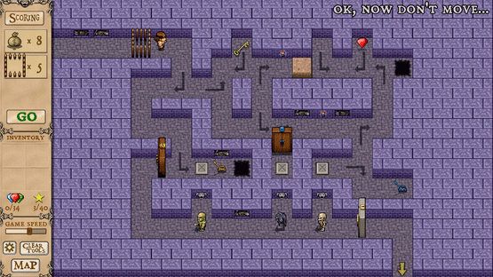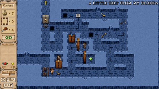 Questy the Adventurer, a talented fantasy barbarian, has blown through the last of his loot and needs to get his cash flow moving again. Now Boneyard the Necromancer threatens the land from his lair beyond the mountains, guarded by a magical statue requiring three scattered artifacts to be reunited in order to pass through, save the kingdom -- and get paid again. Is the player up to managing this quest?