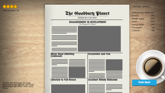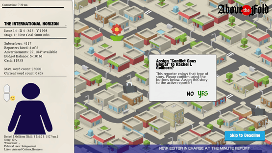 In this newspaper sim, you're the new Editor-in-Chief! Can you turn a small local newspaper into a well-respected media power house? Grow your staff of reporters, get subscribers, win awards and more!
