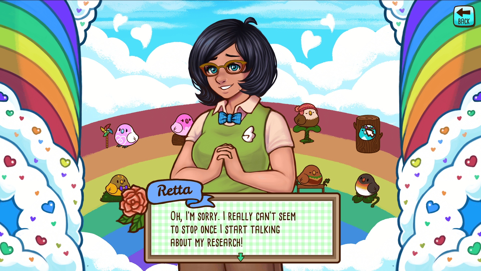 Customize your garden with hundreds of items! Every visiting bird - over 100 of them - has unique dialog, favorites, and heart levels! Play mini games, raise baby birds, decorate photos, and chat with human characters inside and out of the visual novel style story mode!