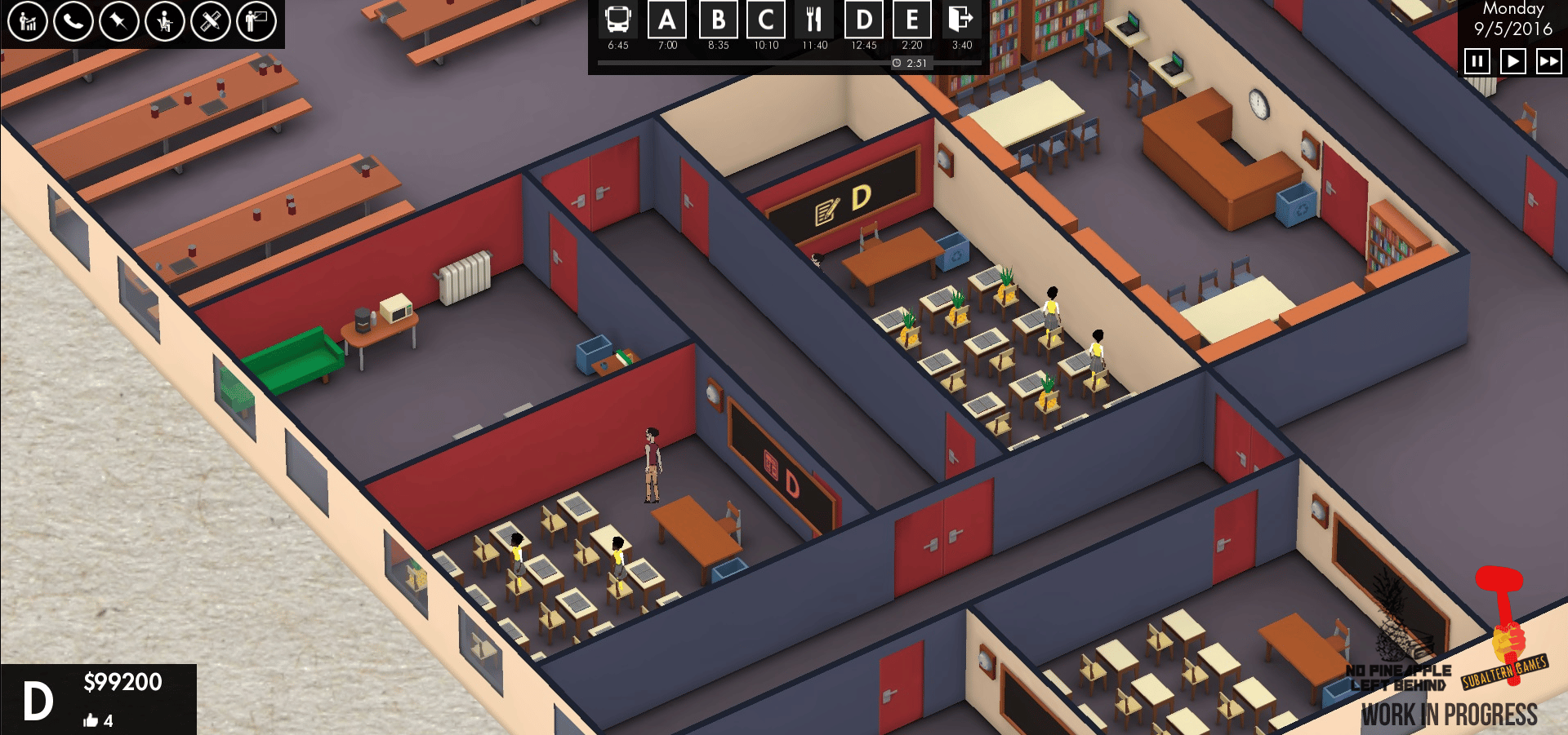 In No Pineapple Left Behind, an evil wizard shows up to a school and turns all of the children into pineapples. Pineapples are very simple. All they do is take tests and get grades. If they get good grades, the school makes more money. But, if left unattended, pineapples can turn back into children. (Oh no!) Children are far more complex and expensive than pineapples. You are the principal. Your job is to run the school.