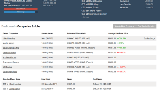A free browser-based business simulation game. Manage your own company, trade stock, speculate currencies and much more. The game features a realistic, fully player-driven economy. Create, trade and manage companies. Over 10 different company types including banks, holding and resource production. Invest in public company shares, resources and floating currencies via The Exchange. Features a selected set of countries and cities on a map, where you can locate your apartment building or retail store.