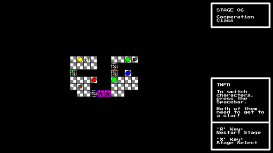Solve environmental puzzles by pushing boxes around, making bridges, pushing buttons, and riding conveyor belts. In certain stages, you will be given a partner, and you can switch control between you and your partner at any time.