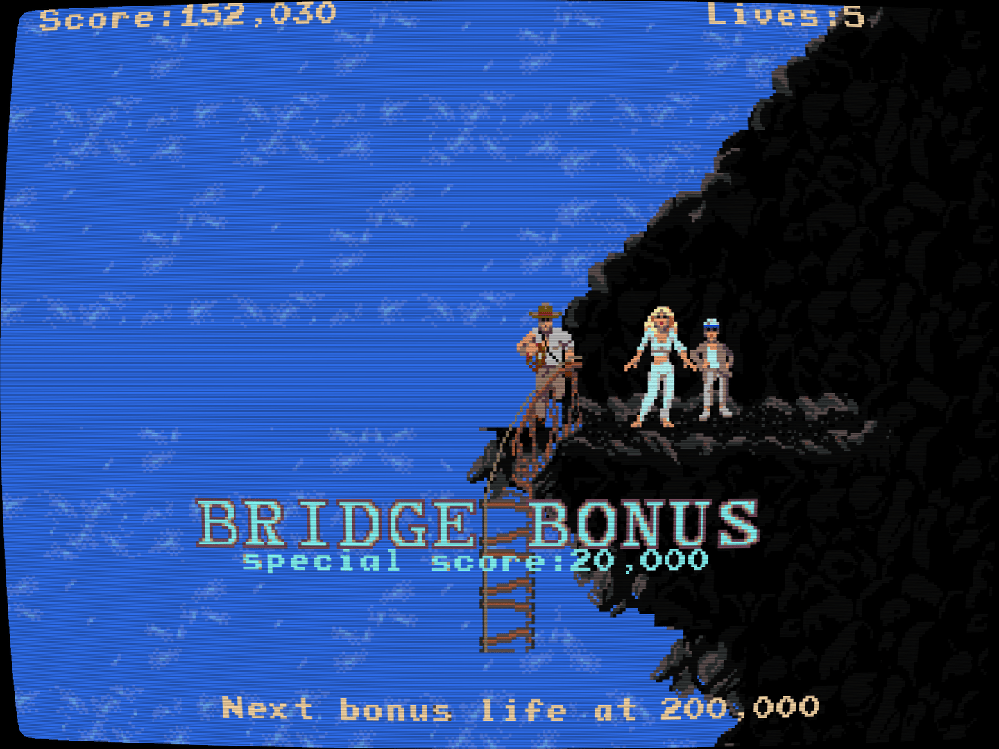 As Indy, the player must complete several cycles of the following three types of levels: 1.Mine level: Whip your way through a mine in order to free children that are held captive. Use your whip to swing across chasms, climb ladders, ride along conveyor belts and defend yourself against attacks from Thuggee guards, bats, snakes and the fireball-throwing Mola ram. Escape with the mine cart after you've freed all children. 2.Mine cart level: Pick the right route through a network of tracks while riding in a mine cart. Avoid potholes, broken tracks & guards in carts and safely reach the end of the track. 3.Temple level: Make your way to the altar and grab the Sankara stone while Mola Ram, bats and Thuggee guards attack you. Watch out for that lava.