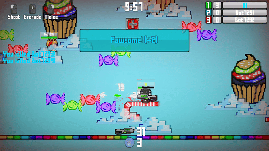 Run, jump, scratch and fight to be the purrrfect combat cat! Choose from a variety of different characters each with its own unique ability and skills. Be careful though, there are no nine lives here! Shoot laser weapons and throw hamster grenades at all those that dare to stand in your way!