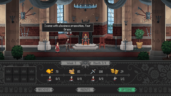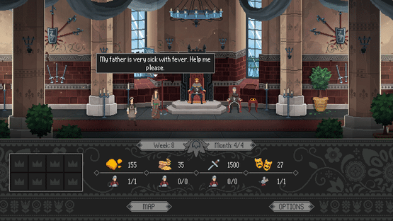 In this kingdom management RPG, petitioners will arrive in the throne room each turn to ask for your advice and assistance. Decide whether to help them with their problems, or to conserve resources for more important matters. Remember: supplies are limited, and not everyone has the kingdom’s best interests at heart...