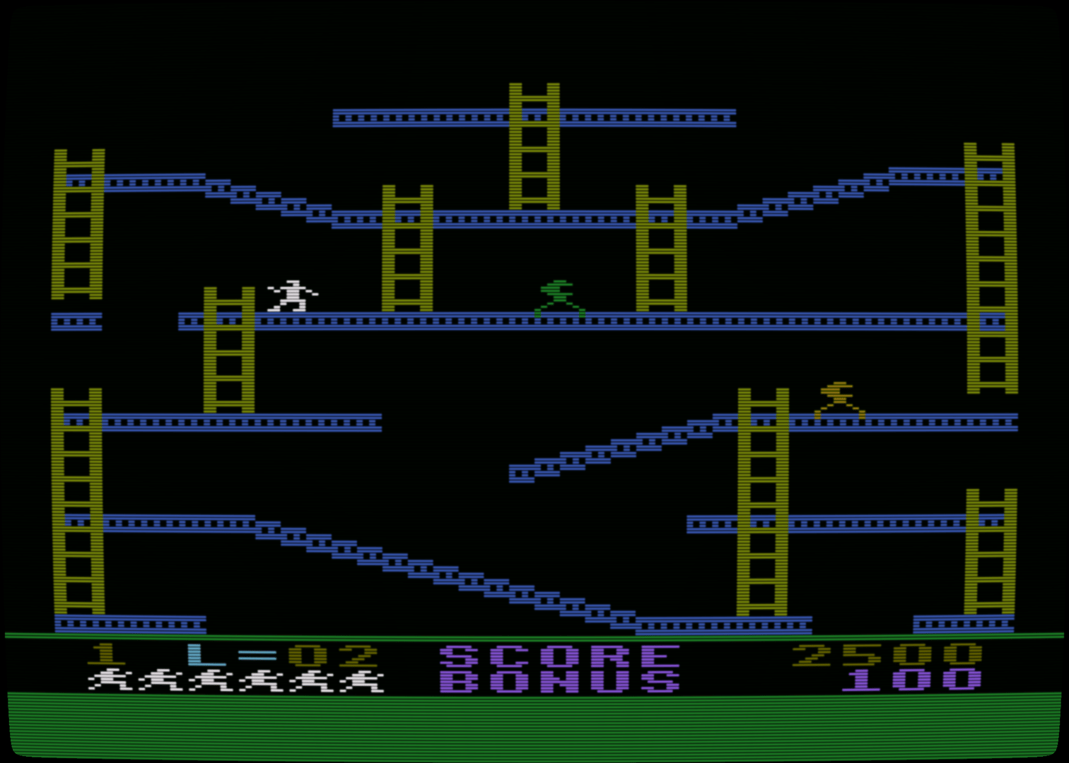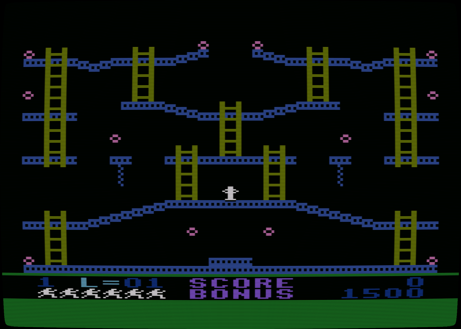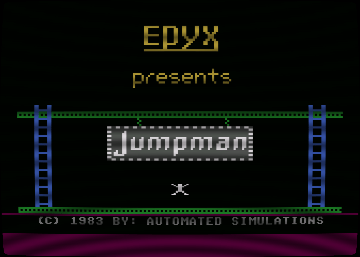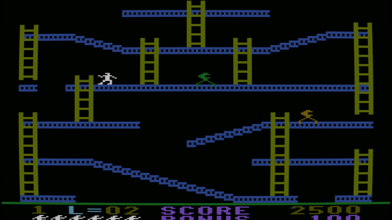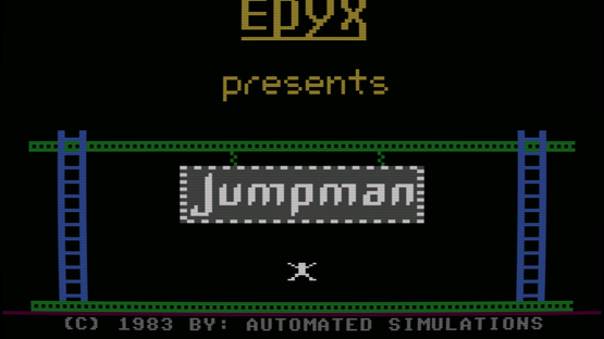 Jumpman Junior is the sequel to Jumpman and features similar gameplay with all new levels. As Jumpman, your goal is to disarm all of the bombs on the level before time runs out. Each level consists of a variety of platforms, ladders, and ropes you will need to jump and climb to reach the bombs. To make the game more challenging, a bullet will fire on the screen from time to time which will cause Jumpman to lose a life if hit. Each level has a different theme to it, and a few also have additional dangers as well. You will encounter deadly fires, the bouncing hellstones, moving ladders, disappearing platforms, and more.