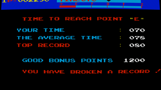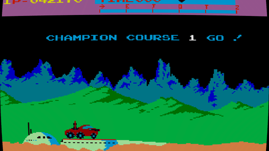 Moon Patrol is a side-scrolling shooter that puts players at the controls of a six-wheeled moon rover that can jump and shoot. The goal is to move through the entire course as quickly as possible while shooting enemies for additional points. Cannons are mounted on the front and top of the vehicle, and both fire simultaneously when the fire button is pressed. Rocks, mines, and pits in the course prevent you from just holding to the right for maximum speed. Rocks and mines can be shot, but pits must be jumped. Some enemies fire shots that create new pits in the course, forcing players to react quickly.