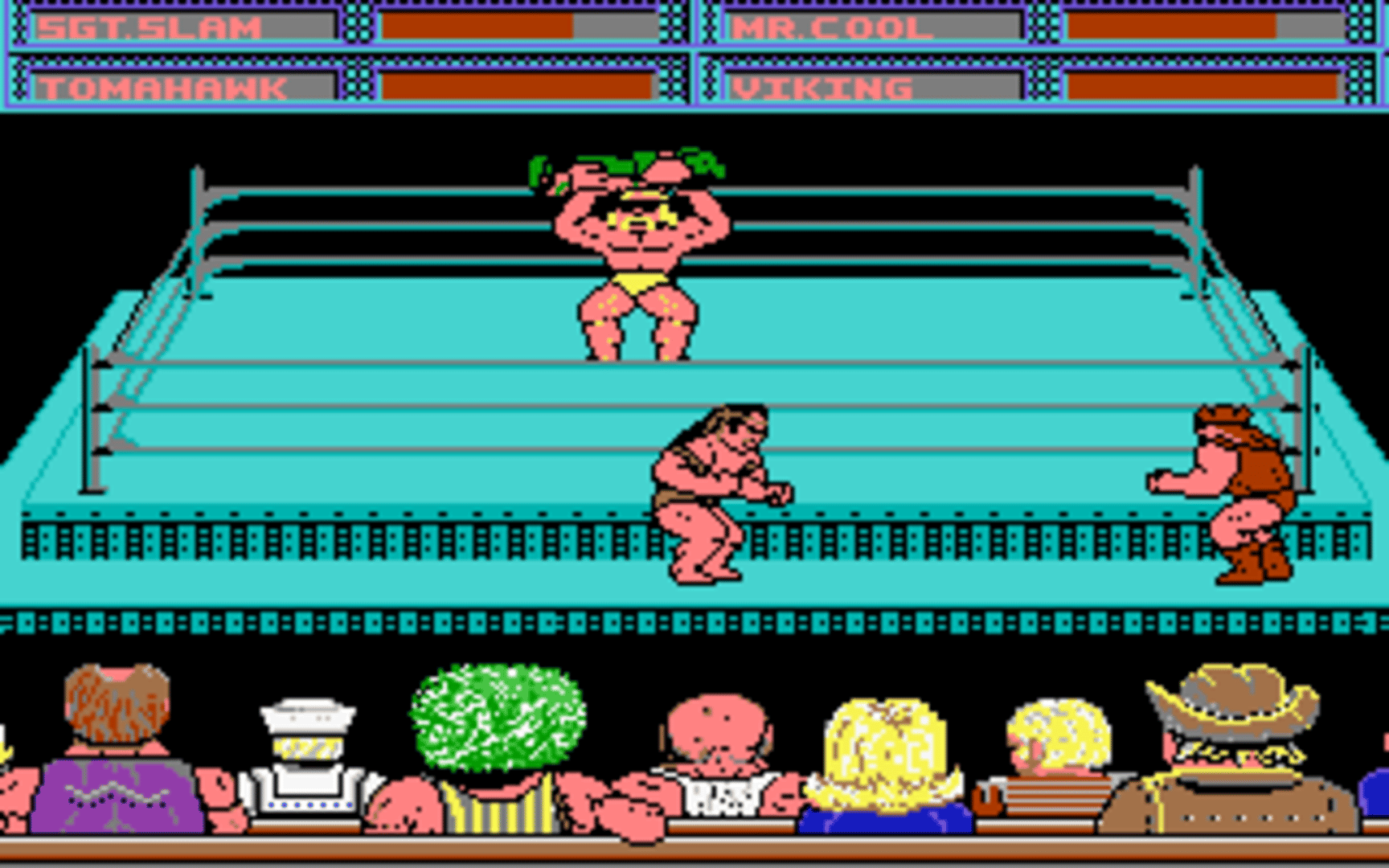 Take Down is a tag-team wrestling game in which one or two players assemble their two-man powerhouse from a line-up of 8 wrestlers: Mr. Cool, Sgt. Slam, Tomahawk, Iron Head, Viking, Sea Dawg, Sultan, Ninja. Each wrestler has a short audio intro when selected. Selecting two of them, players start the fight. The gameplay is flown on a static ring without a referee. Both of the tag partners are starting the action on the same side of the ring. Every wrestler has a few standard moves, including a punch, tag out, jump from the turnbuckle and flying body press off the ropes. In addition, each has a set of four signature moves (action plus direction), ranging from a basic hip-toss to a devastating airplane spin. Once player gets the other guy in a bad way, he leaps on top to try to collect the pinfall. The winning squad is treated to a little victory dance in the ring, specially embossed belts, and a victory in the game's record books. The losers are similarly given a tally in the loss column, however this doesn't affect their abilities.