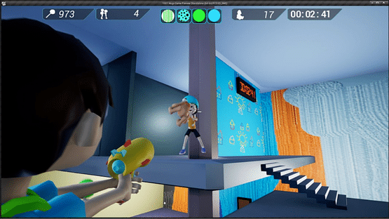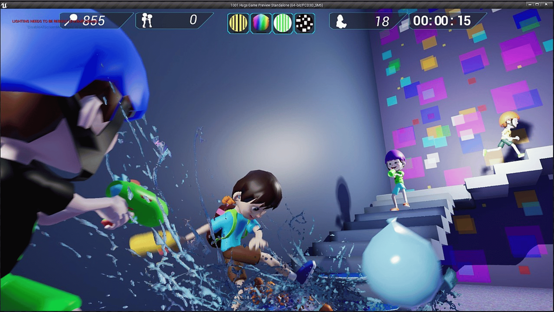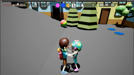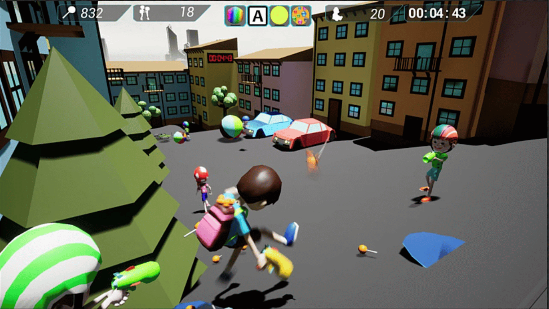 You have a limited amount of time to find and hug four kids to open the portal to the next level. These 4 kids are distinguished by certain colored helmets, which change on every level or on restart. You are equipped with a teddy bear launcher, which will be used to defend yourself against kids with water balloon guns.