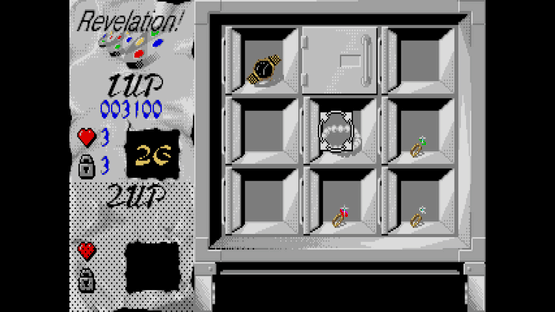 Revelation is an abstract puzzle game based around cracking codes on safes. Each of the 80-plus levels is a top-down view of an arrangement of locks and dials, which must be aligned so as to unlock each section by having identical colors touching each other. Not all locks can be moved however, and all of this must be done within a time-limit. Your time to collect the gold (by opening each of the 9 doors in sequence in the hope of finding lots of bling) is limited by how long you took to crack the code. There is a bonus game to unlock, as well as extra lives and special power-ups. A password system ensures that a level need only be cleared once.