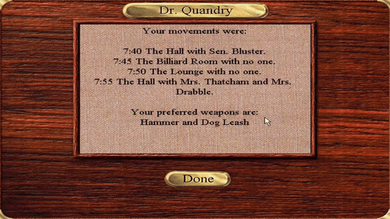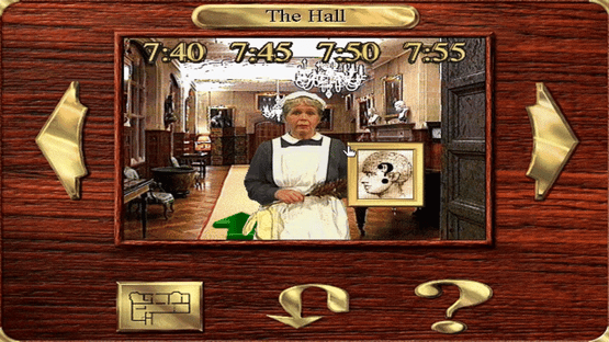 Something terrible has happened at Awkward Manor! For all those who love a good murder mystery, here is a new twist. Now you can explore an elegant English mansion, just as if you were there in person. Forget virtual reality- Virtual Travel makes it real! There are ten different game levels to satisfy every age and ability. As a gumshoe detective at Level 1, you'll get lots of help, but as a skilled detective at Level 10, it could take you an hour or more to solve each mystery! Awkward Manor has fourteen beautifully photographed rooms and thousands of places where suspects may have left clues... there's a clue now, under that chair! It looks as if Major Gallop was in the library! When was he there? Ring for the butler, he may be able to help you... Oh well, not this time! Let's go upstairs to the Royal Bedroom... Mrs. Thatcham's there! She may know more about the Major's movements! Let's ask her where she was at 7.45... Yes! As she walks away, she says she was with Major Gallop in the Ballroom! Maybe he was in here as well! Make a thorough search and... What's this above the wardrobe? Ah ha!, the murder weapon! Now we're on the murderer's trail! Who else was here?... Gallop! Again! It looks very bad indeed for the Major! The room, the weapon, the time, and finally- the Accusation! Gotcha! Now Sergeant Plod arrives to take him away! Shall we go on to a more difficult challenge? Yes! And next time you play, the mystery will be completely different. With over 4,000 different solutions, why not invite your friends over? Up to six players can take part- or you can solve the mystery yourself! The extensive on-line help and tutorial system is always just one click away. Much better than a manual, it actually shows you how the game works, and gives hints to help you solve each mystery. Virtual Travel incorporating over 5,000 color photographs. 14 Rooms: 7 Upstairs, 7 Downstairs. Over 2,000 sounds. Thousands of clue locations.