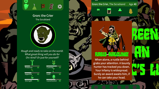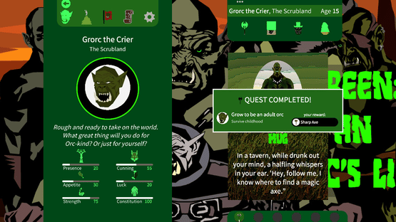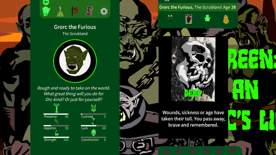 A Reigns-like card-swiper. Grow an orc. Pilot it through a life of pillage, plunder and gluttony. Build up your horde, become filthy-rich with loot, even become a god! Planned for release- early 2020 for Steam and mobile.