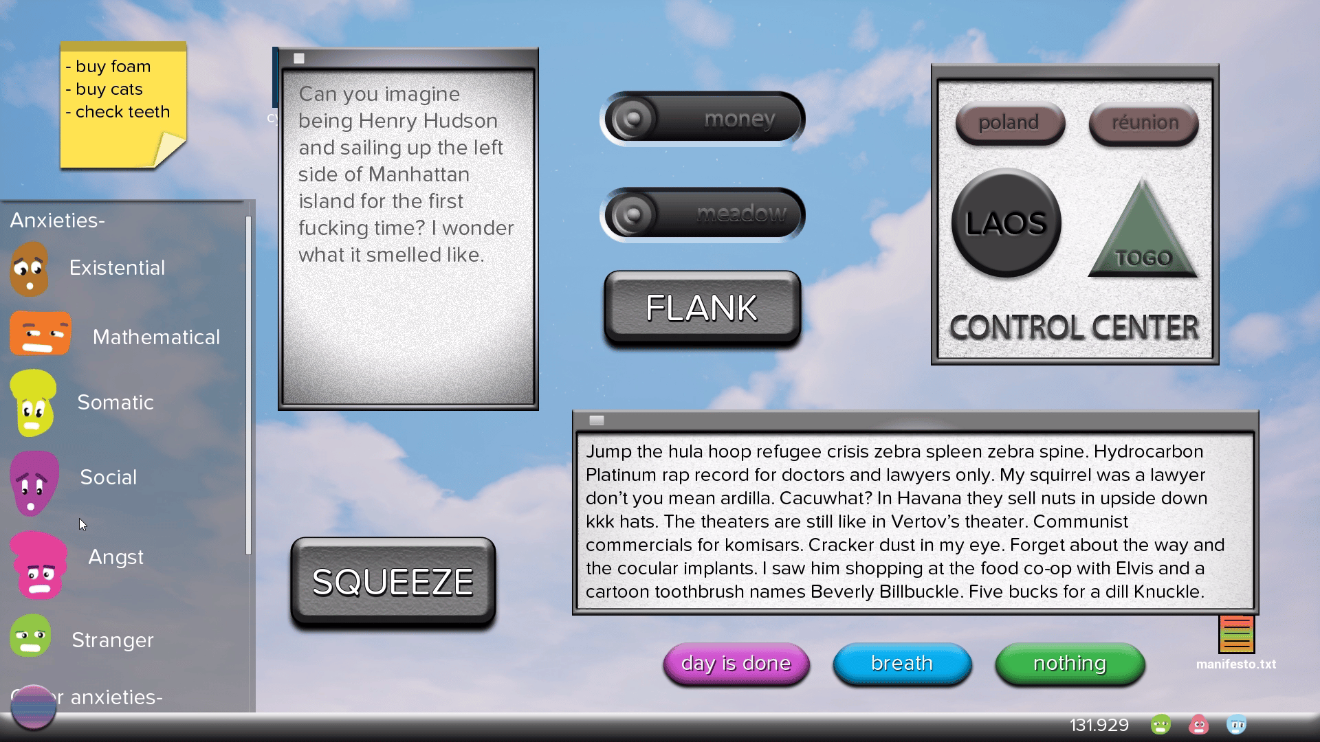Go to work or get an internship with anarcho-syndicalists. Go to other galaxies and dimensions. Fly a living ship around. Fight mother nature's aunt. Slide down an apocalyptic spa. Snort moon rocks with your landlord. Ride the train. Get evicted. Talk about nothing in particular. Play an operating system instrument.