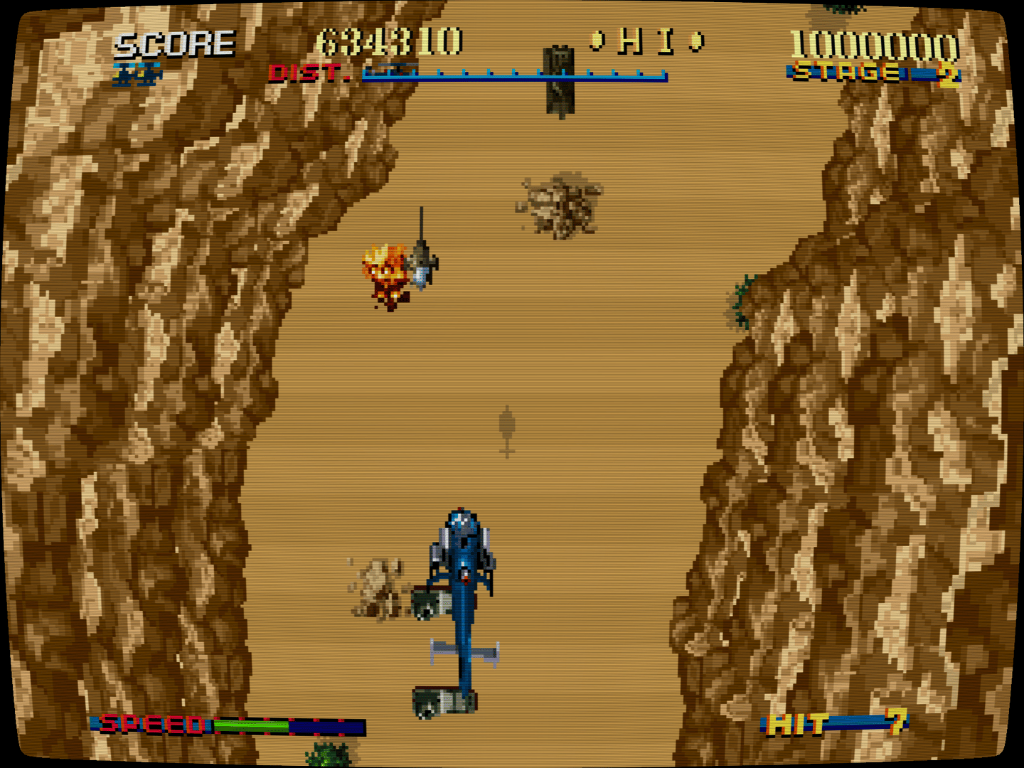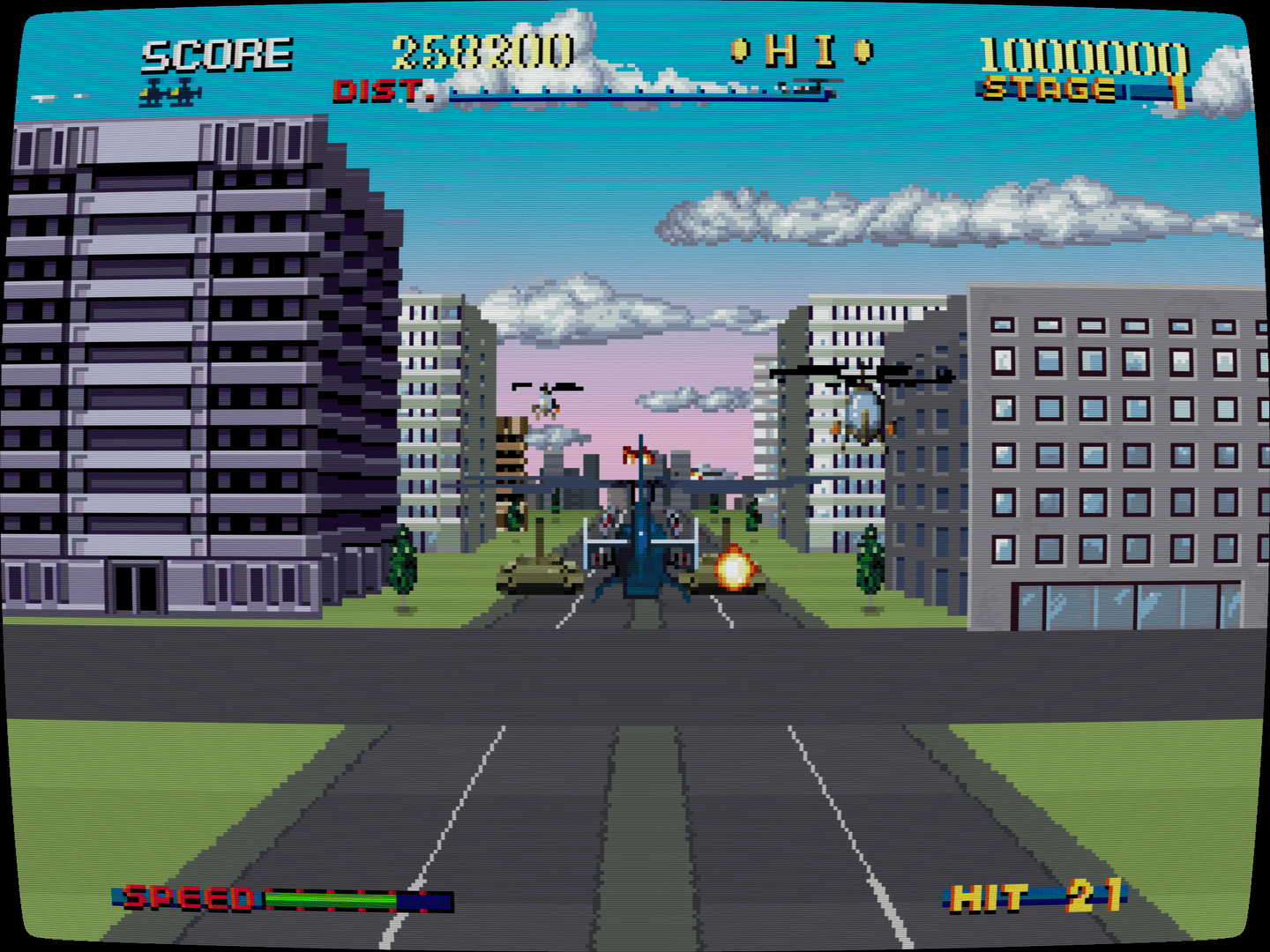 A helicopter shoot-'em-up developed by Sega. The Arcade version made use of Sega's 3D super scaler technology to create city environments where the buildings would appear to have depth. The subsequent home versions sadly lacked this feature.