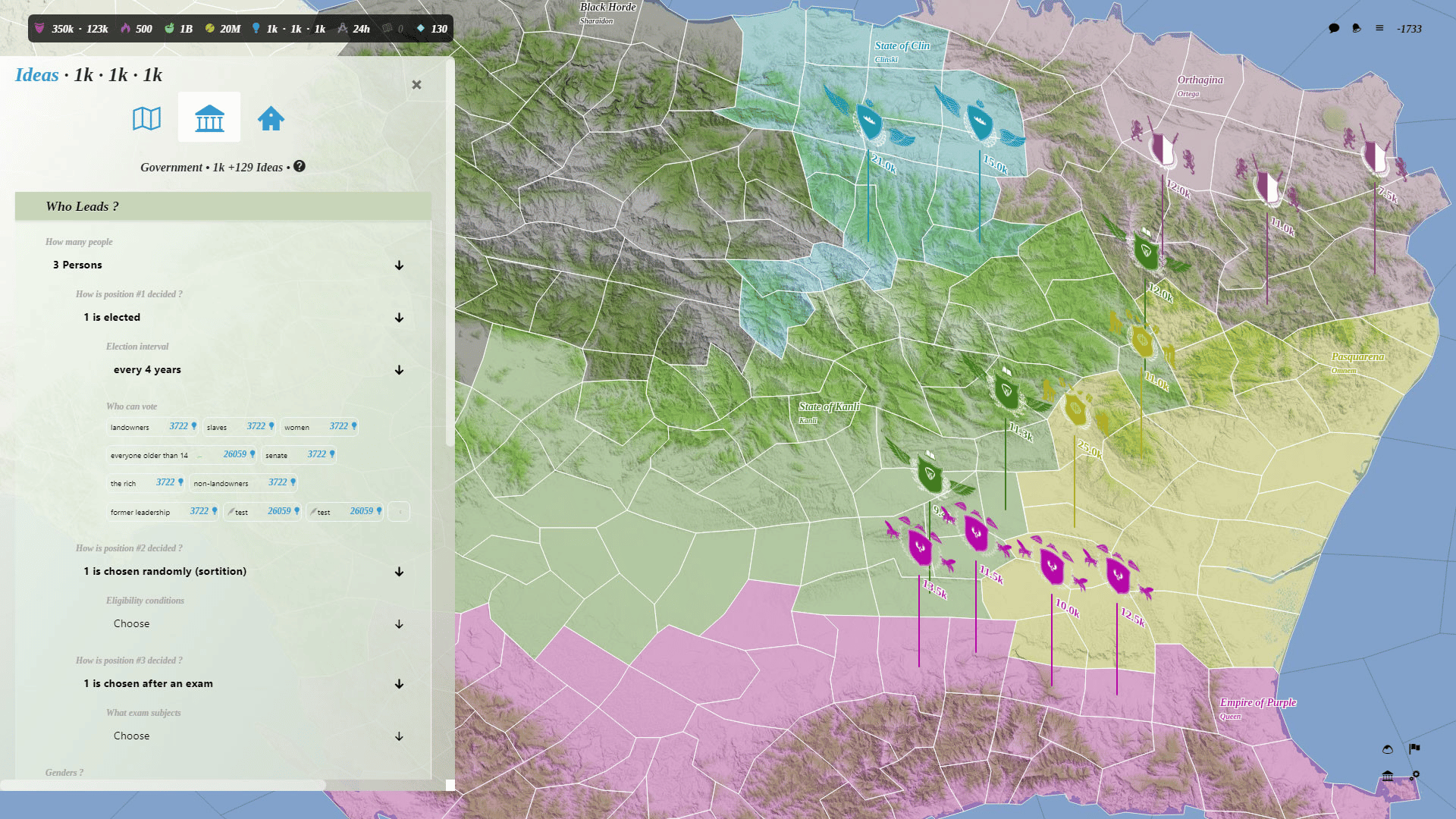 After a number of incarnations on Earth and unhappy with the opportunities nations offer souls to grow, our hero, Kanli (you) is offered a chance to .. do better. He will try, over a number of simulations, to build a state, survive the hardships of time whilst helping as many souls as possible evolve beyond the taints.