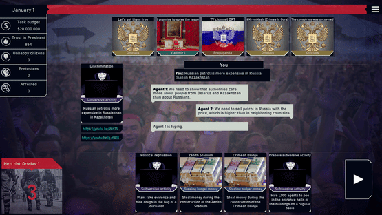 In this game, you have to become a spy from the USA. Your key goal is to incite a revolution in Russia. It's the right time to bribe officials and lawmakers just to make them doing those unacceptable things and accepting ridiculous laws. People have to get out on the street and riot.