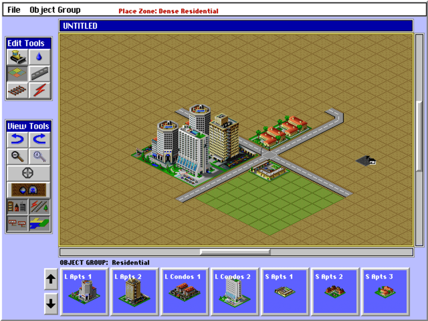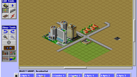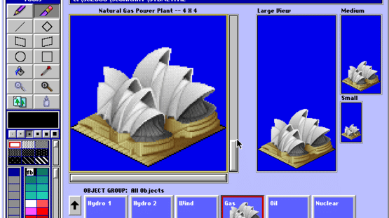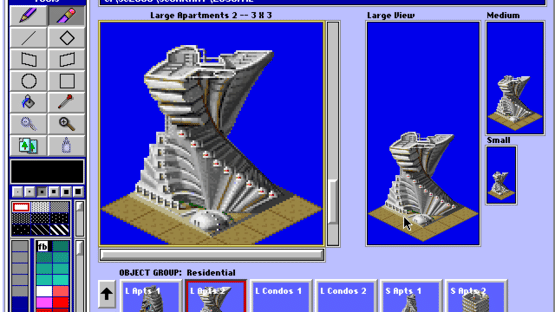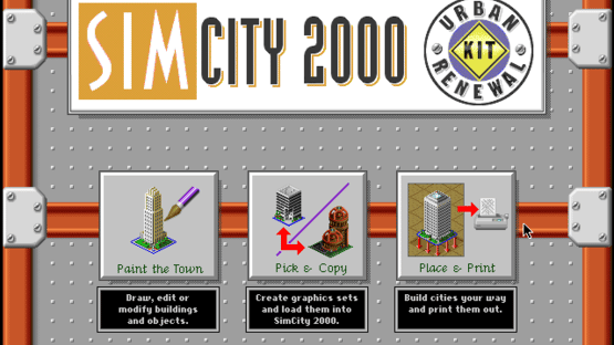 SimCity 2000 Urban Renewal Kit was a comprehensive city customization addon that gave players complete control over both city layout and building design, allowing them to manually place individual structures and create custom graphics sets using specialized drawing tools that maintained SimCity 2000's perspective and supported color-cycling animations. The kit included over 100 futuristic buildings for post-2000 cities, the ability to print out your cities, and the ability to mix and match custom graphics sets. The created cities maintained compatibility with SimCopter and Streets of SimCity as well.