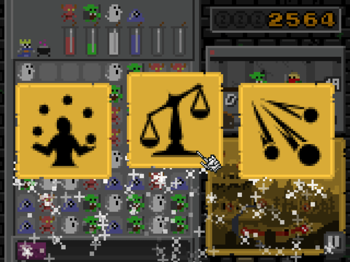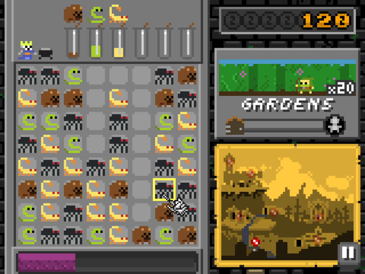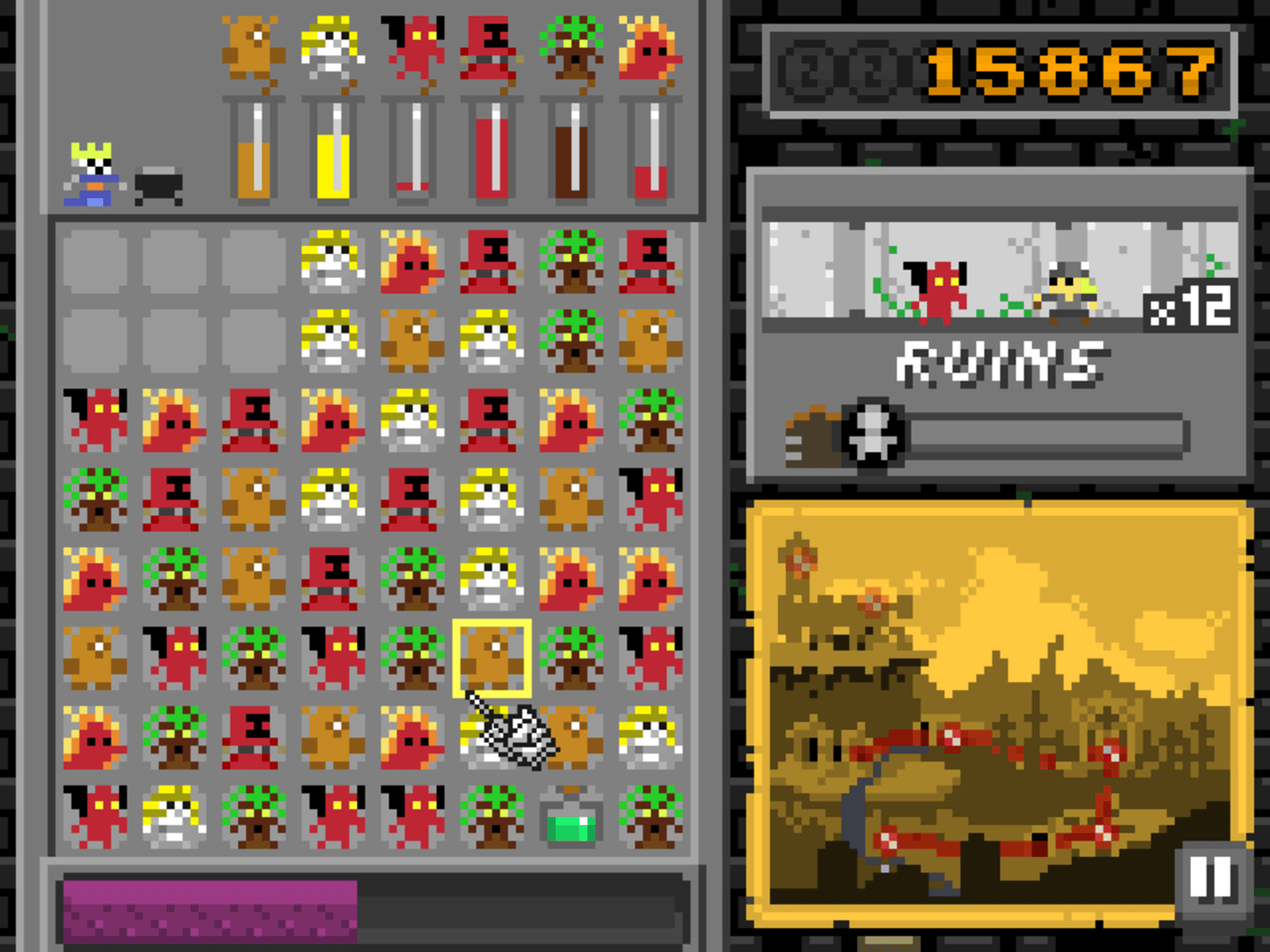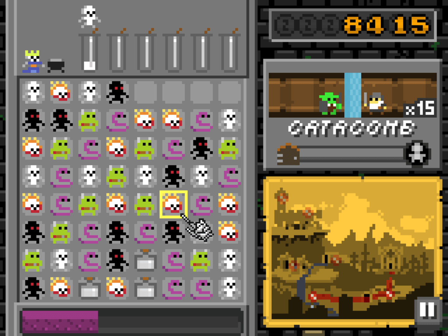 In this fast-paced, action puzzle game, you will need to defend your home against a band of heroes intent on ending your un-life and taking your treasure. As heroes assault your domain, you will need to combine essence in order to summon monsters for defense. Match 3 of the same type of monster on the grid to gain some essence. Acquire enough of the same essence to summon that monster. Your monsters will fight against the heroes, stalling their advance and keeping them from reaching your inner sanctum. Every monster type and hero has unique stats: Health, Attack, Physical Defense, and Special Defense, and each monster and hero will attach with either Physical or Special. Based on these stats, your monsters will fare better against some heroes than others. Your realm contains 7 locations, each with it's own, unique monsters. When a hero is left unopposed by your forces, it will gradually, but steadily advance through the current location. When the hero reaches the end of a location and moves on to the next one, your leftover essence will be used to construct a temporary, magical barrier, which will block the heroes from advancing for a short time.