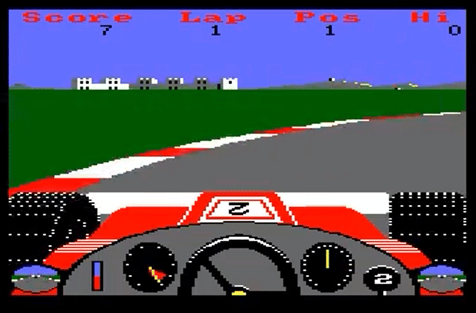 3D Grand Prix is a 1st person perspective driving game where you must race against various other drivers over five laps to win the race on a randomly generated track. You start on the grid and when the lights turn green you accelerate away changing up the six gears your car has. As you accelerate you need to keep an eye on your rev counter, have it too high and your engine will blow and it is race over. As you approach a bend you are told the recommended speed to take the bend and you are updated regularly the weather with updates. As you finish a lap the road surface becomes checkered indicating you can stop your car to use the pits.