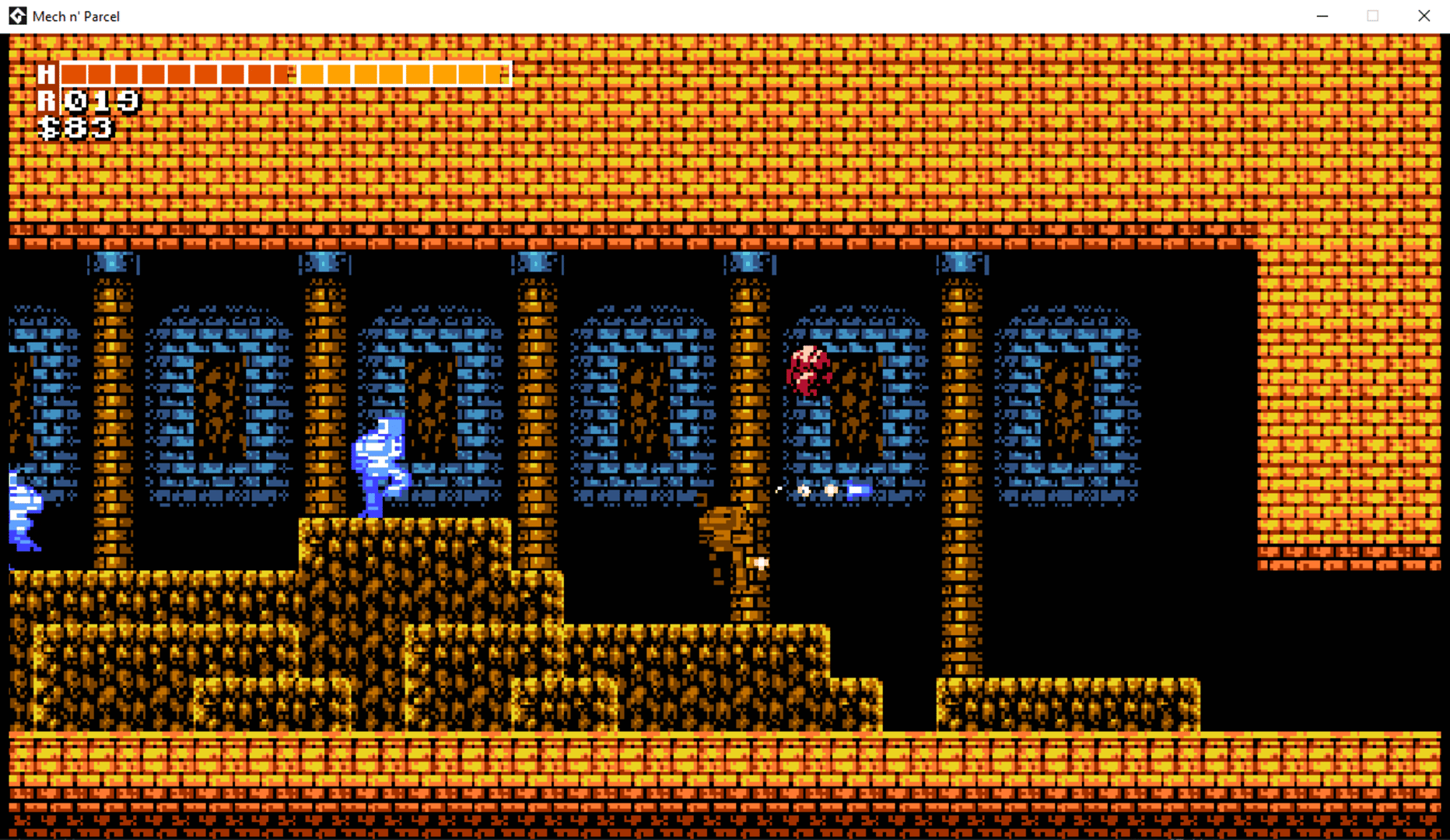 Made for the Retrograde 2020 jam! Our theme was to simply make a retro game, from around the NES era. Of the 10 days we had, according to my timer this took me almost 9 of them! Mech n' Parcel is a game about a world where even after the apocalypse, people still need to get their mail. Of course the outside world is dangerous, so the delivery drivers are mech pilots. What else would they do? You get given a life-changing job, but the route you'll have to take will be a lot more dangerous than your normal routes. Cut through Pyro's, Green Thumb's , and Flywheel's territory to get your package to the recipient!