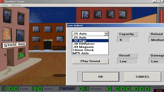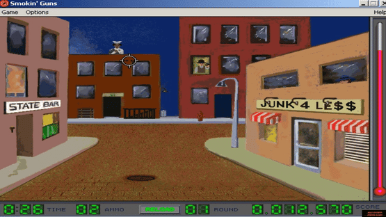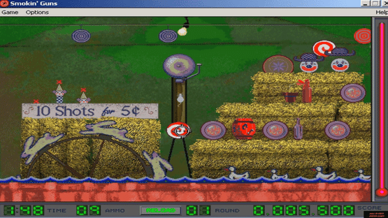 The game represents a shooting gallery with six scenes, each with a different guns and targets: a total of 36 guns and over 100 targets. The scenes represent: 1) Gangsterland. You as a law defender take on the crime lord and clear the streets of his filth. 2) House on the Hill. You survive through a night at haunted house or become a permanent resident. 3) County Fair. You visit a county fair and try to score as much bounties as possible. 4) Neptune Six. You defend the control room against renegade android raiders. 5) Silicon Gulch. You siege a Wild West town to get rid of bandits. 6) Terminal Flight. You rescue the hostages in airplane full of terrorists. The events of the game occur on static screen, where you should shoot as much enemies appearing in certain places as possible. Innocent people should not be touched. Time is flown, ammo should be reloaded, and points are gained for successful actions. Top Scores are stored for each scene separately.