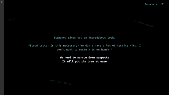 The player will take the role of Vektor Pavlov, a scientist aboard the Peresmeshnik during the Cold War. A creature has boarded the ship and is stalking the crew. As the player, you will make meaningful choices that will affect the outcome of the story as you navigate the halls of the Peresmeshnik and escape the terrors that stalk you. All while managing your paranoia. Will you trust your fellow crew-members? Or will you descend into a state of paranoia as you isolate yourself from the others? The choice is yours.