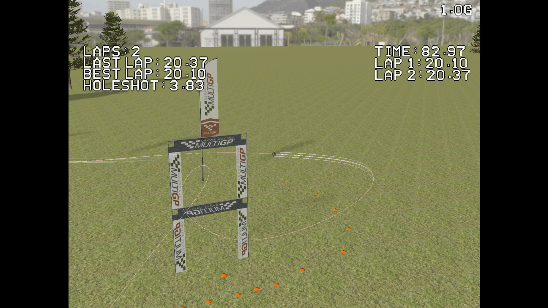 This simulator is a true FPV Drone Racing simulator. The goal is to make it look and feel as similar to a standard racing drone as possible. As such, the goal is not to make the most HD/GoPro-esque visuals. Instead the focus is on simulating what pilots see through the goggles, static and all!