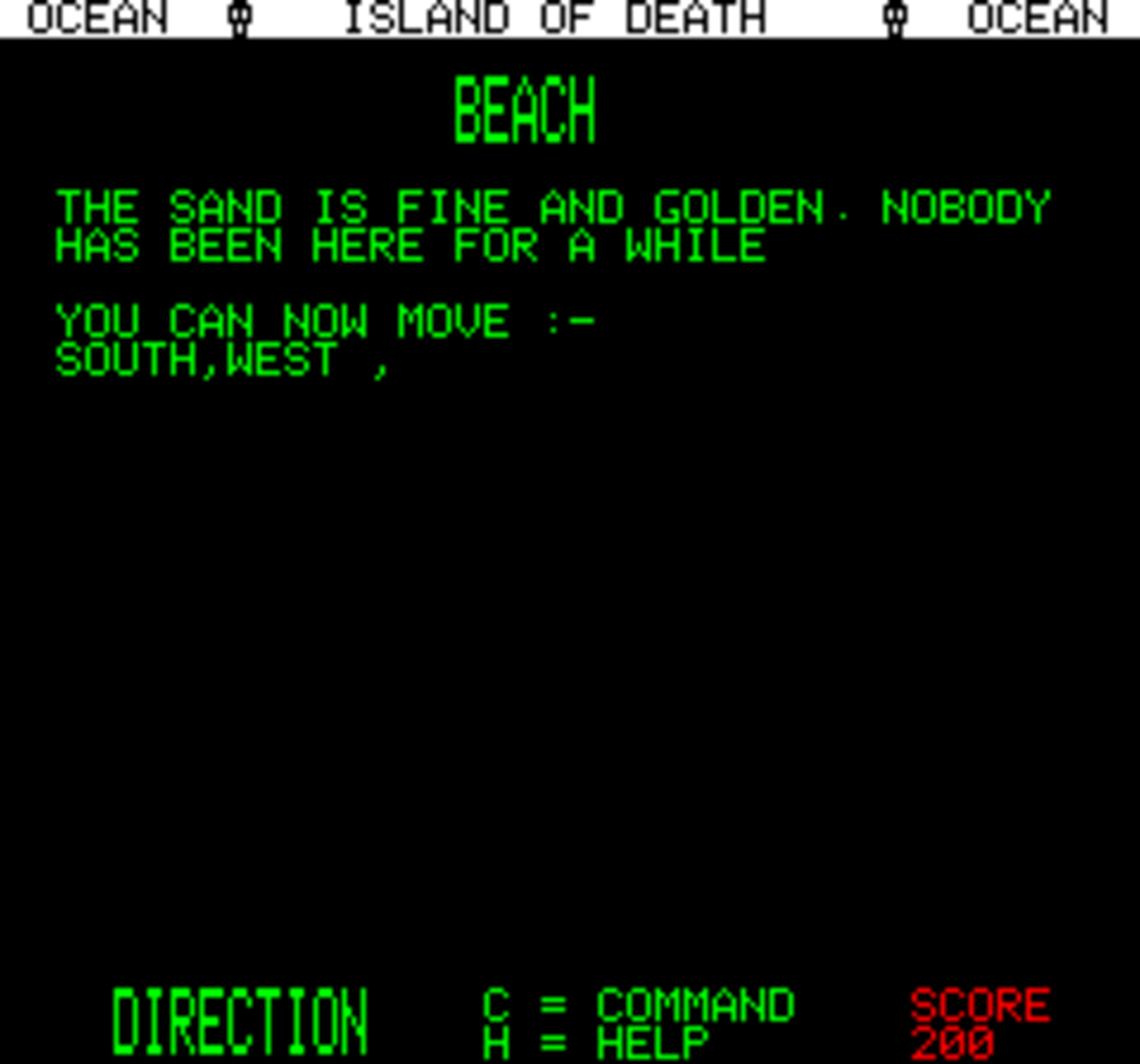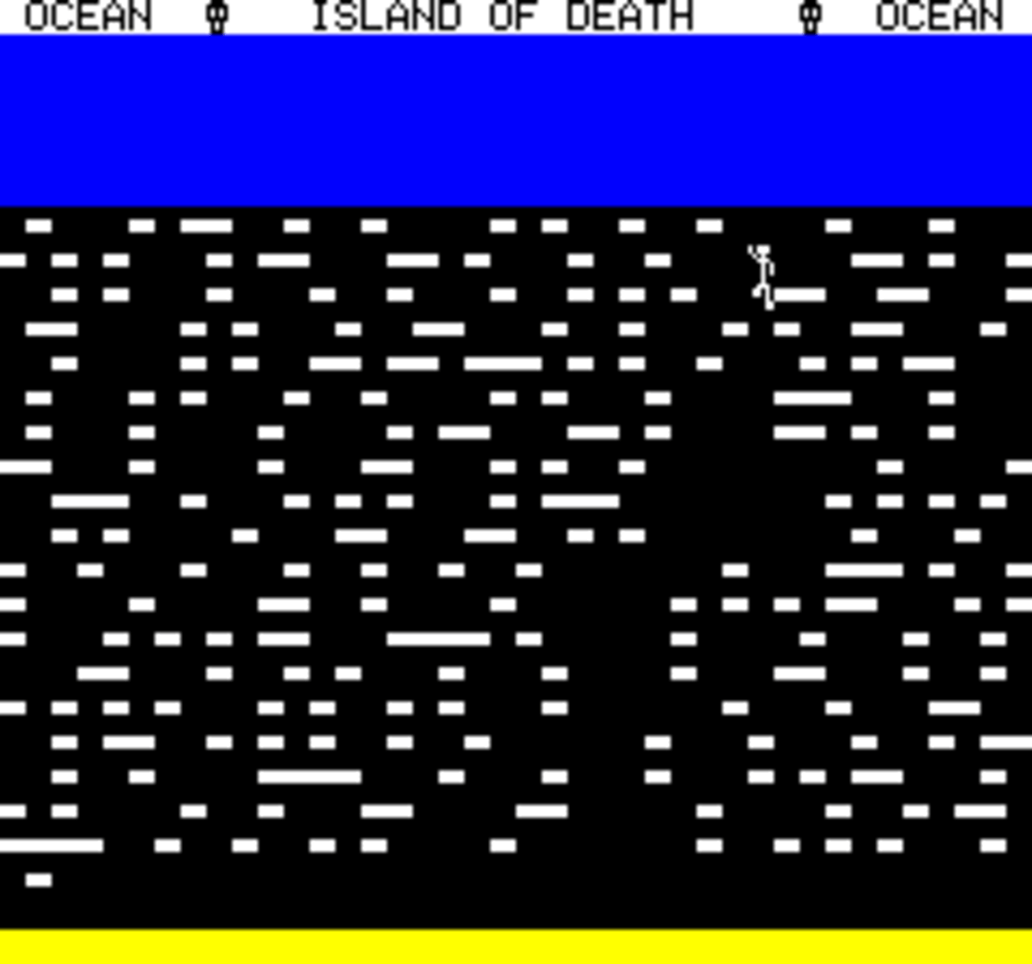 Released on the Atmos Oric in 1984, "Island of Death" is a mixture of text adventuring and arcade action, Island of Death puts you in the shoes of the sole survivor of a shipwreck on a coral reef. In order to escape you need to find the six treasures of the island. Dangerous encounters come in the form of simple arcade games.