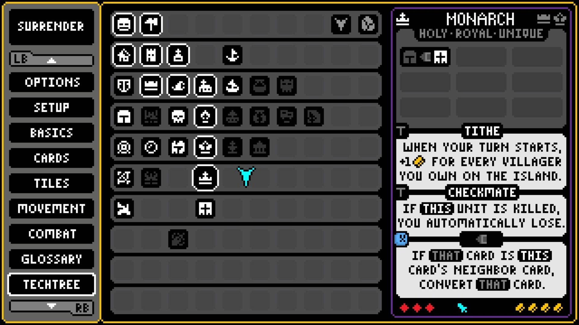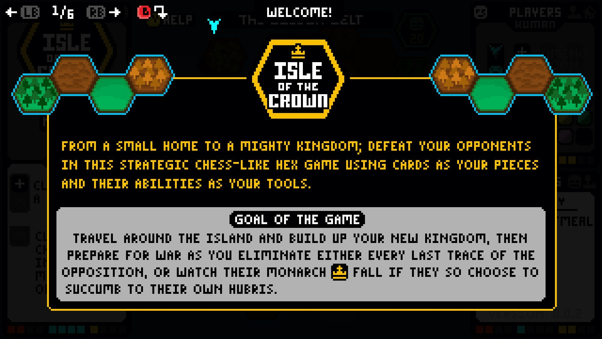 From a simple home to a mighty kingdom; explore, expand, exploit, and exterminate your opponent in this strategic pixel-art chess-like hex game using cards as your pieces and their abilities as your tools. As many games before it, and as the saying goes; easy to learn, hard to master.