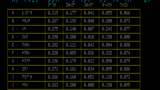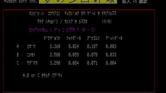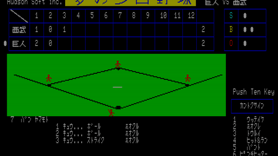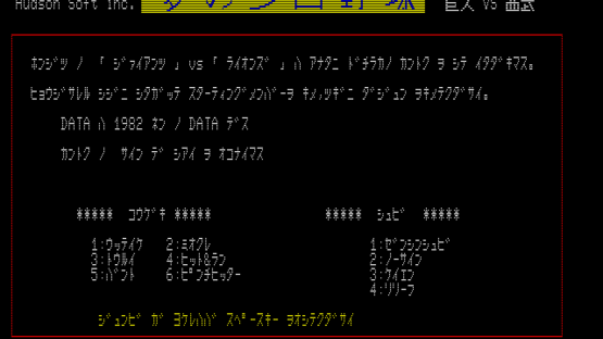 A very early baseball management game. As the coach of the team you manage either the Saitama Seibu Lions or the Yomiuri Giants and make lineup decisions regarding the batting and fielding lineup. Once the game begins you watch a simulated game between the teams. The roster is based on the team roster of 1982.